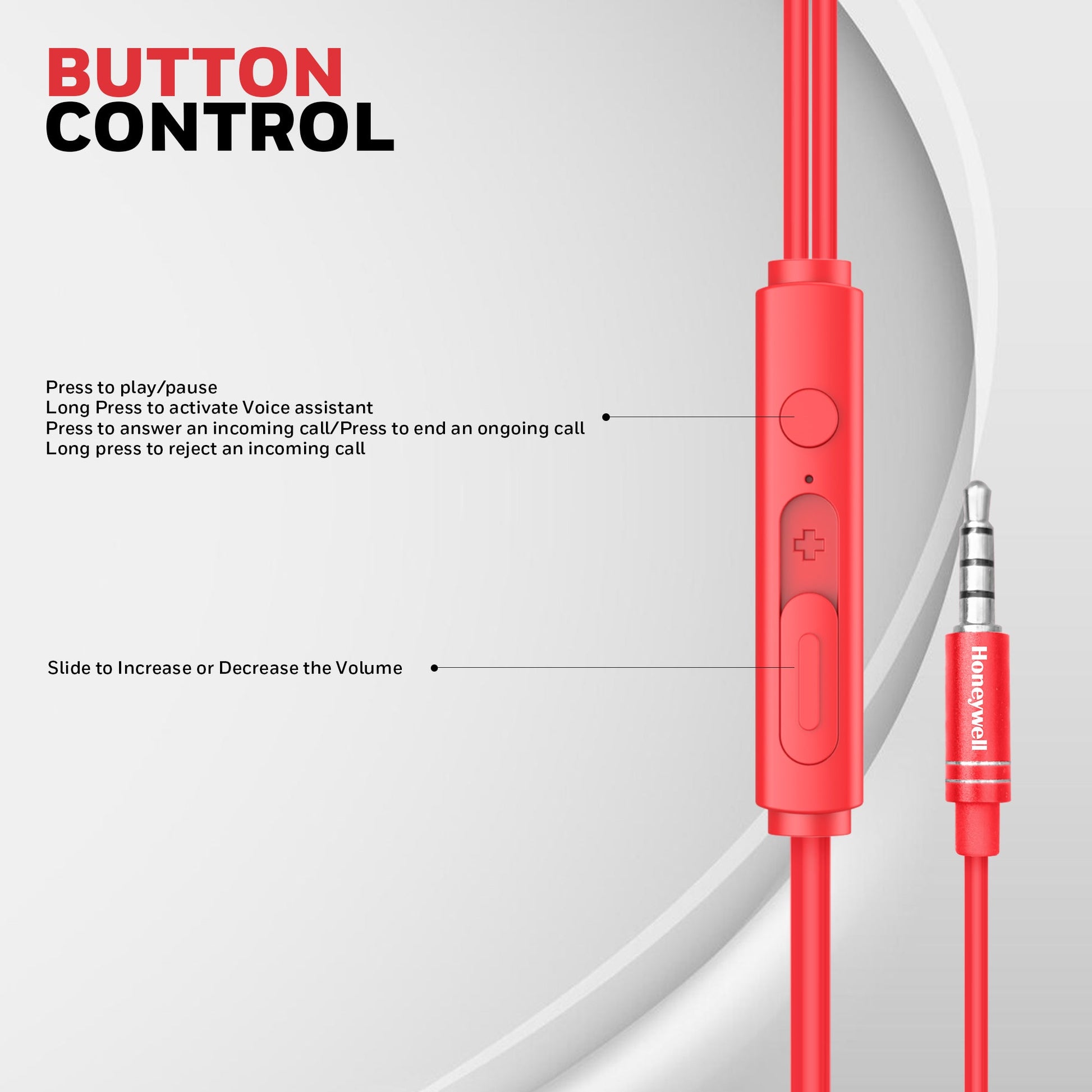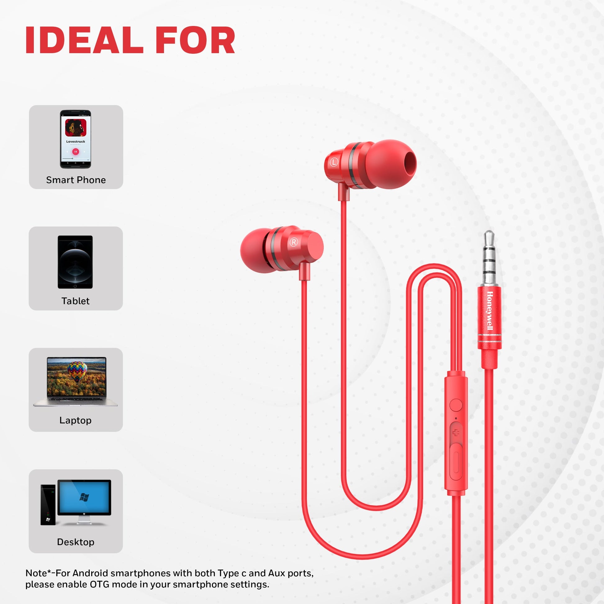 Honeywell Moxie V50 Wired Earphones: Featuring built-in mic, 10mm*2 drivers for clear sound and deep bass, passive noise cancellation, ultra HD mic quality, 3.5mm AUX compatibility, voice assistant enabled, and a 1.2 meter cable for convenience. Ideal for immersive audio experiences on the go.