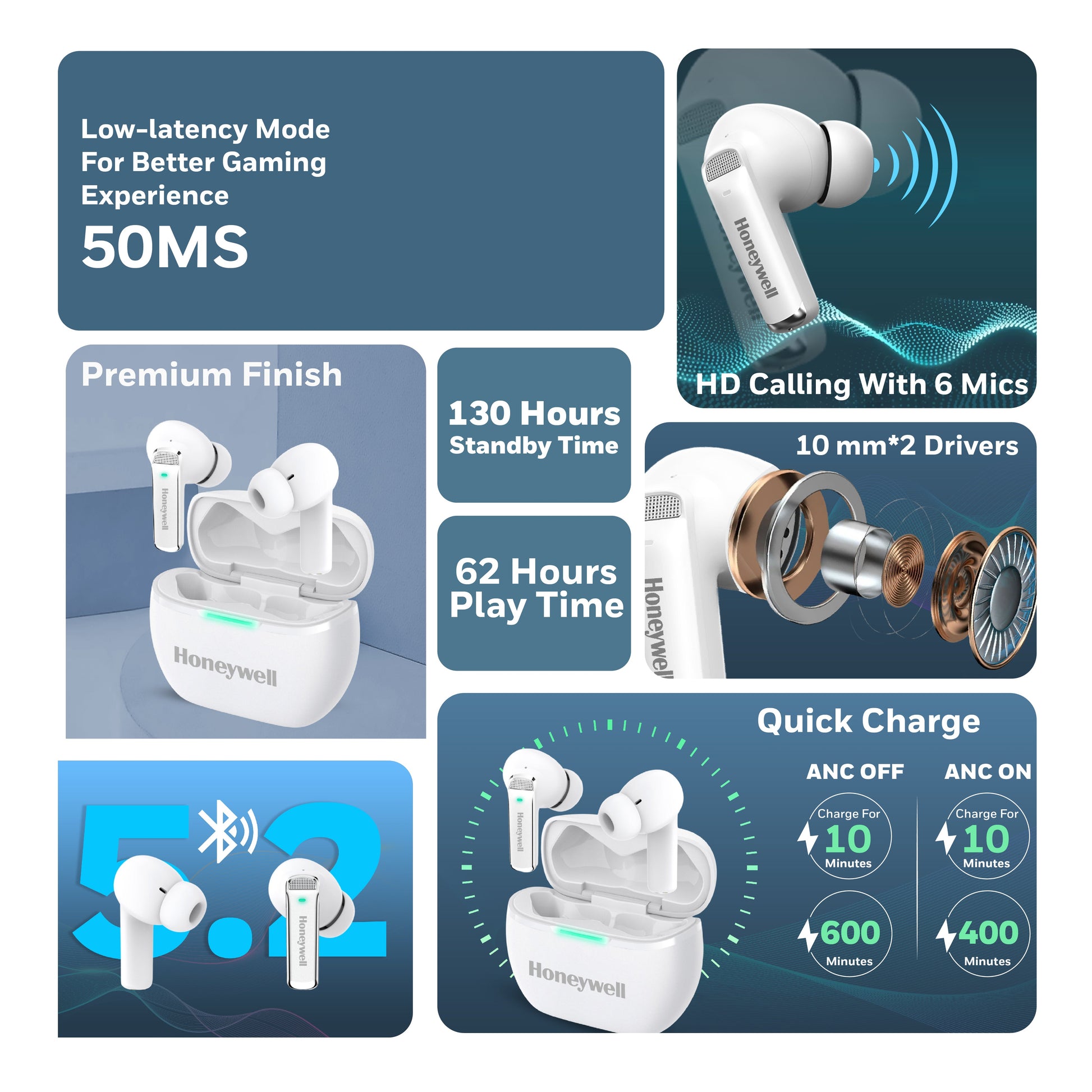 Q: Why should I buy the Honeywell Trueno U5100 TWS? Ans: The Honeywell Trueno U5100 wireless earbuds offers a powerful combination of features and value, making it a great choice for everyday use: 1. Bluetooth V5.2 for smooth, stable connectivity with a 10 m range 2. Up to 8 hours of playtime per earbud with ANC ON, and 12 hours with ANC OFF 3. 320 mAh battery offering up to 130 hours of total playtime 4. Up to 44 hours of total playtime with ANC ON, and 62 hours with ANC OFF 5. Fast Type-C charging for quick and convenient power-ups 6. IPX5 water resistance, perfect for workouts and outdoor use 7. Hybrid Active Noise Cancellation (ANC) combines ENC + ANC for a truly noise-free experience 8. Transparency Mode lets you hear surrounding sounds without removing the TWS 9. Triple microphones in each earbud ensure ultra-HD call clarity 10. 10mmx2 dynamic drivers deliver rich, detailed sound 11. Built-in controls and mic for managing music and calls effortlessly 12. Low-latency mode supports lag as low as 50 m/s for smoother gaming and video 13. Lightweight and ergonomic design for a secure, comfortable fit even during long use