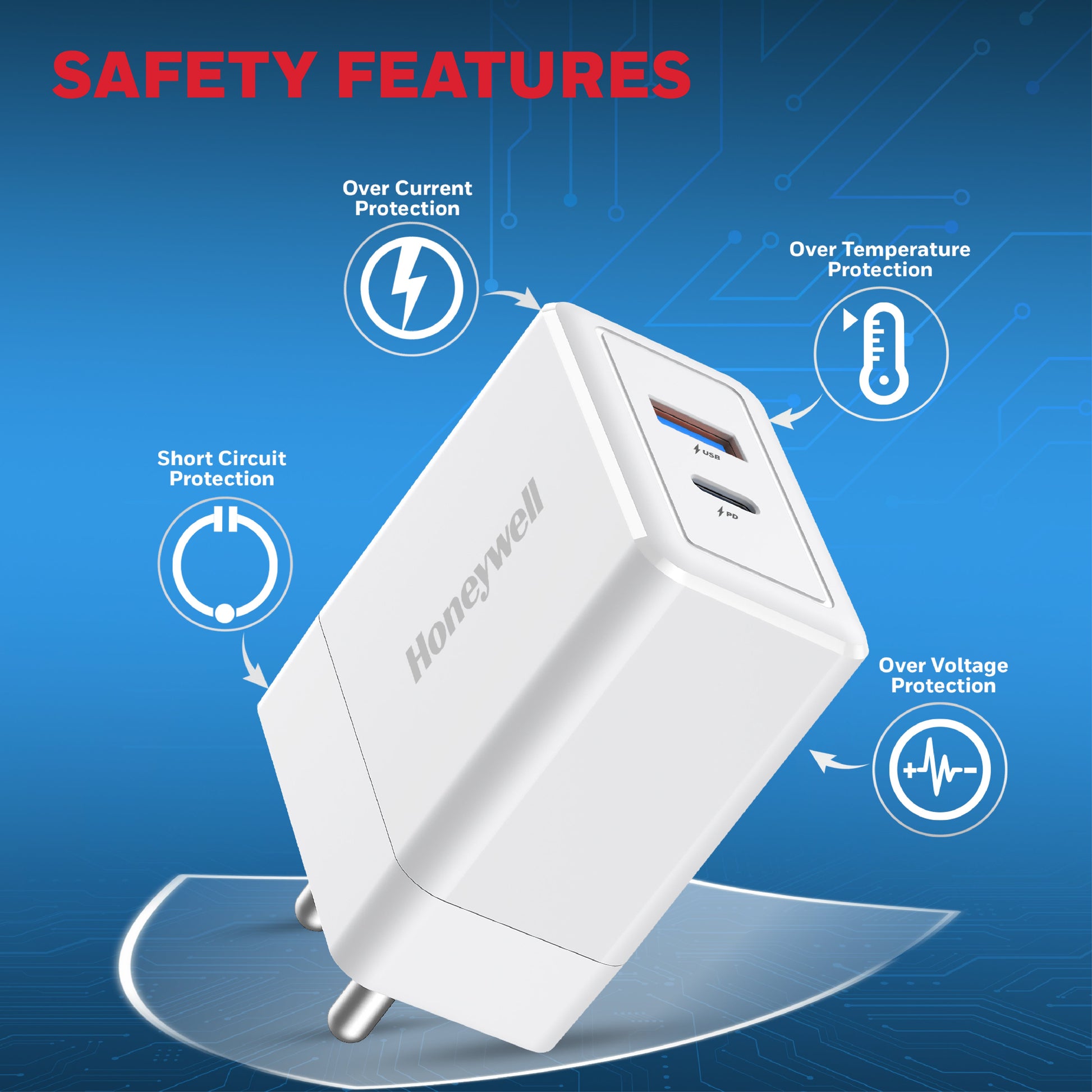Q: What safety features are built into the Honeywell Zest Wall Charger? Ans: The Honeywell Zest Wall Charger includes over-voltage protection, over-current protection, over-temperature protection, and short circuit protection, ensuring complete safety for your devices, making it the best wall charger in the category.