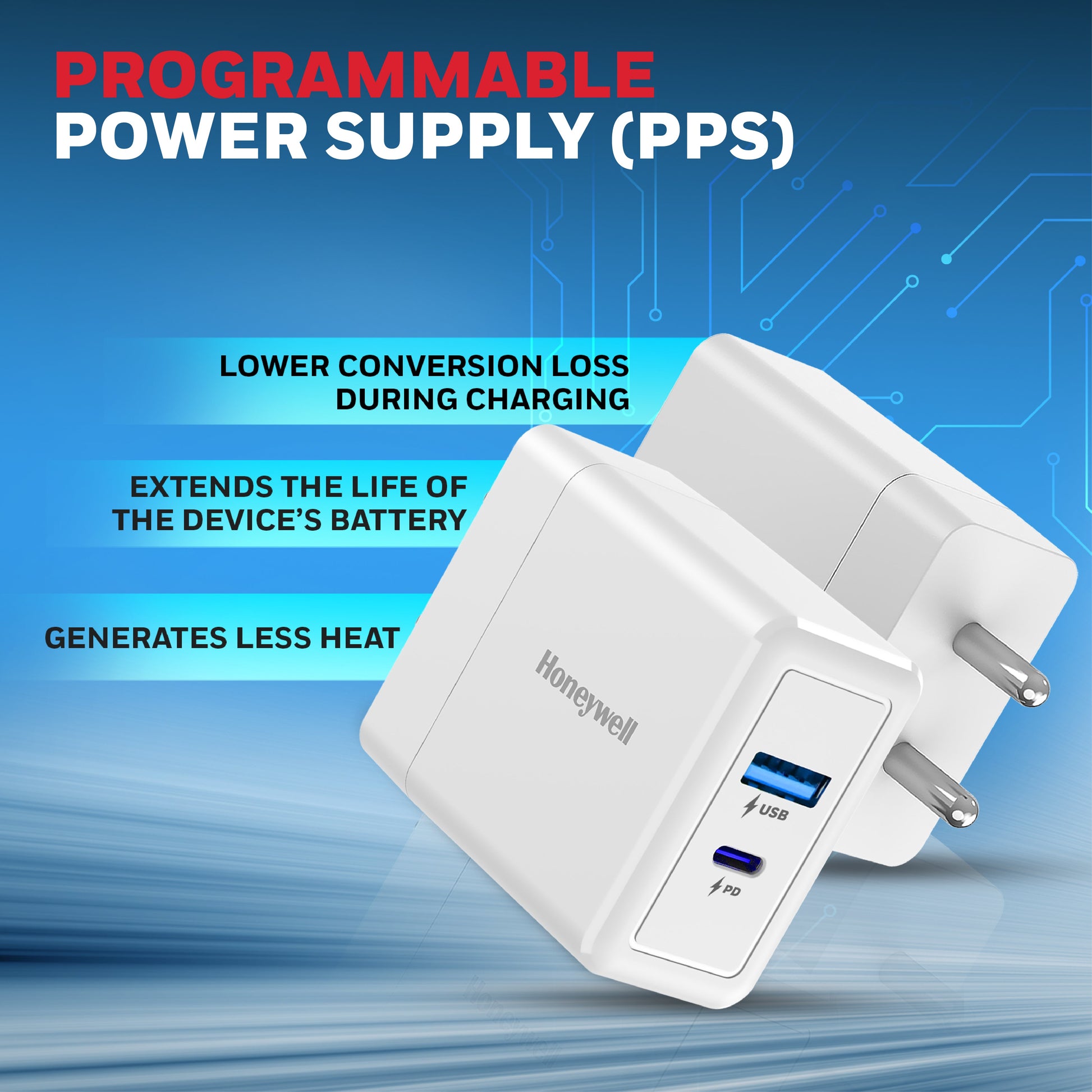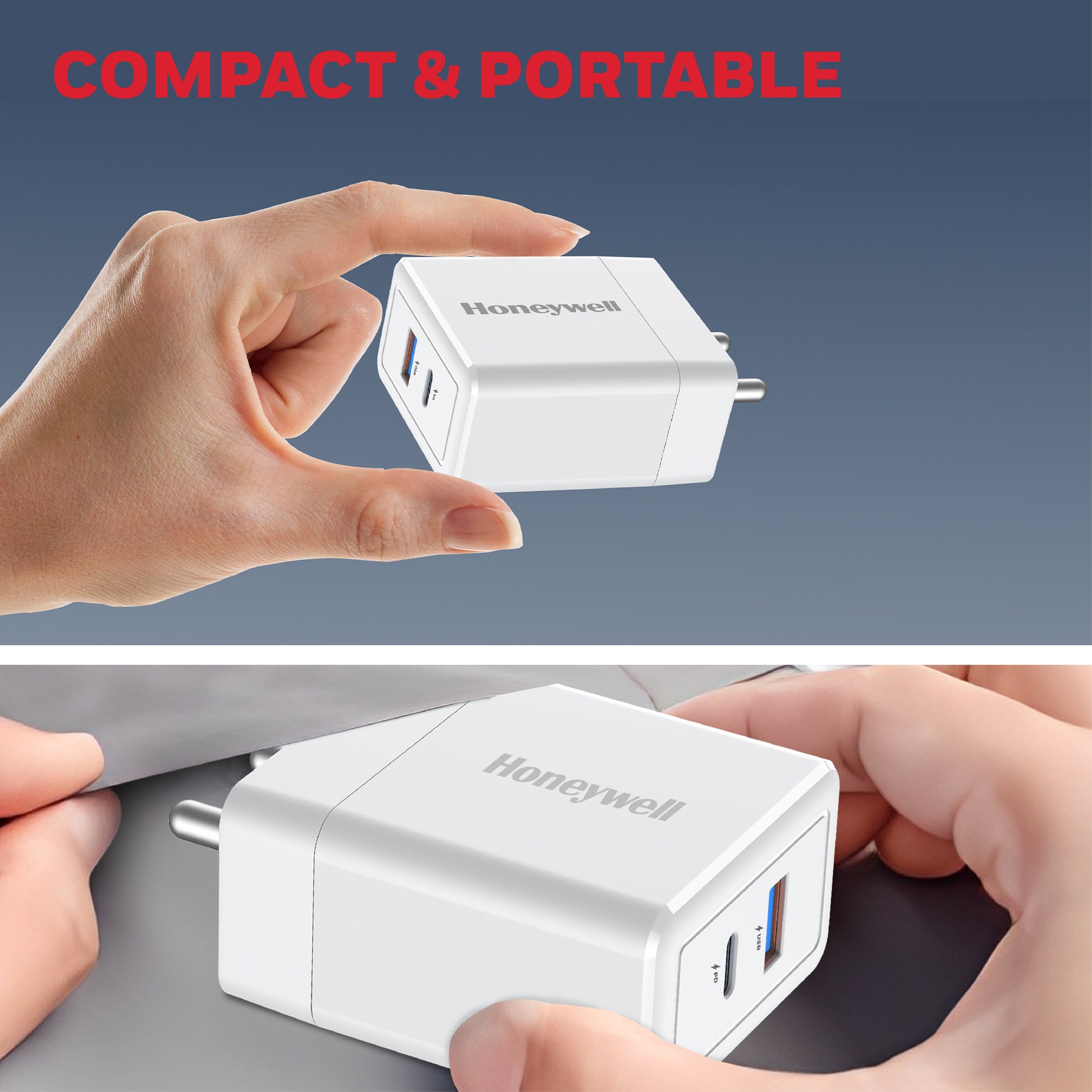 Honeywell Zest Charger GaN 65W: an ultra-fast charger with PPS support, featuring 1x Type-C PD 3.0 port and 1x USB-A port. BIS certified for safety and reliability, it’s compatible with a wide range of devices, including iPhone, MacBook Air, iPad Pro, Pixel, Galaxy, and laptops. With GaN technology, enjoy efficient and rapid charging for all your devices in a compact design.
