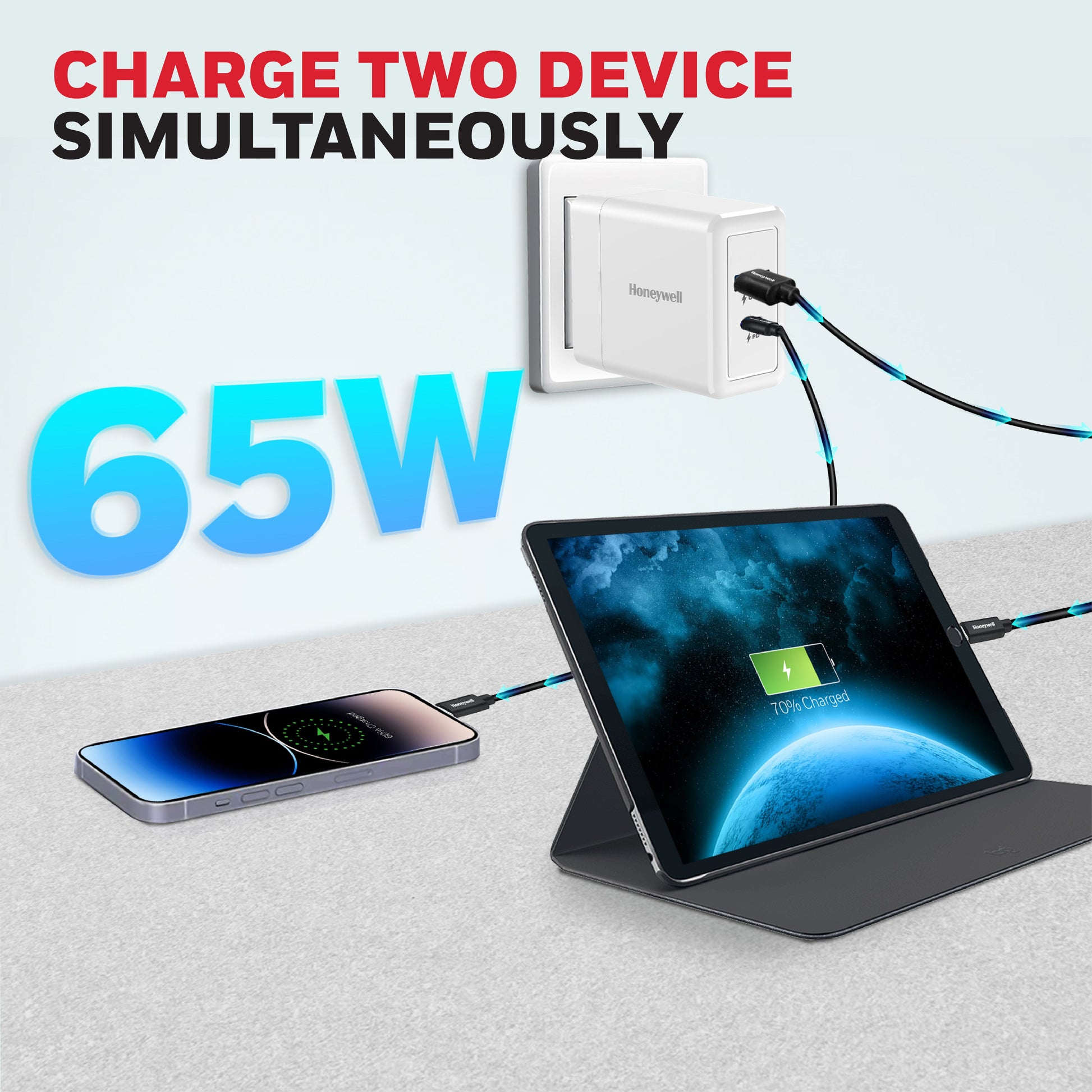 Q: Which devices are compatible with the Honeywell Zest GaN 65W Wall Charger? Ans: The Honeywell Zest GaN 65W Wall Charger is compatible with a wide range of devices via both USB-C and USB-A ports. It supports ultra-fast charging for smartphones, iPads, iPad Pro, iPhones X and above, including iPhone 15, 15 Pro, and 15 Pro Max, as well as AirPods, iWatch, Android phones, and USB-C laptops like MacBook Air/Pro, Dell, and HP.