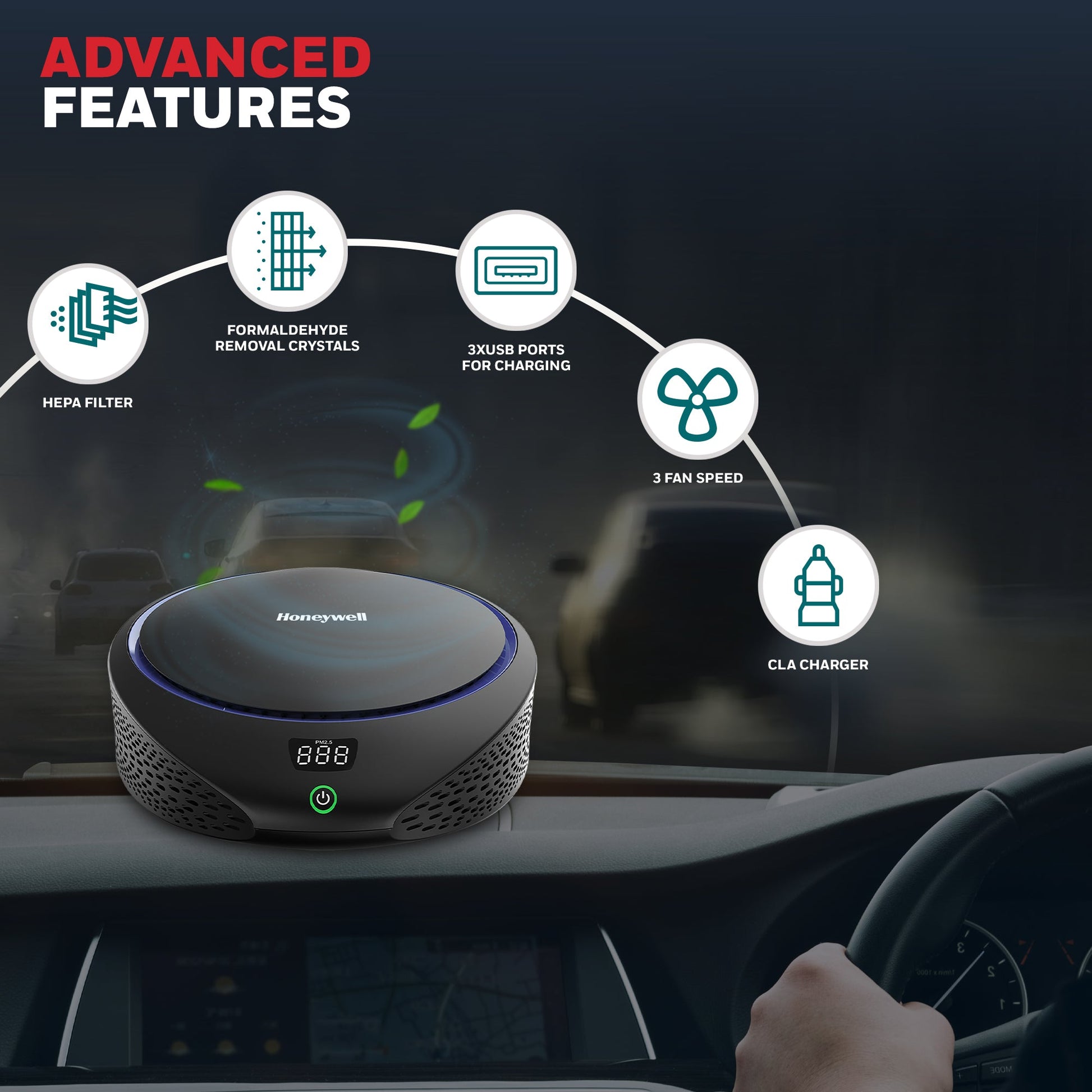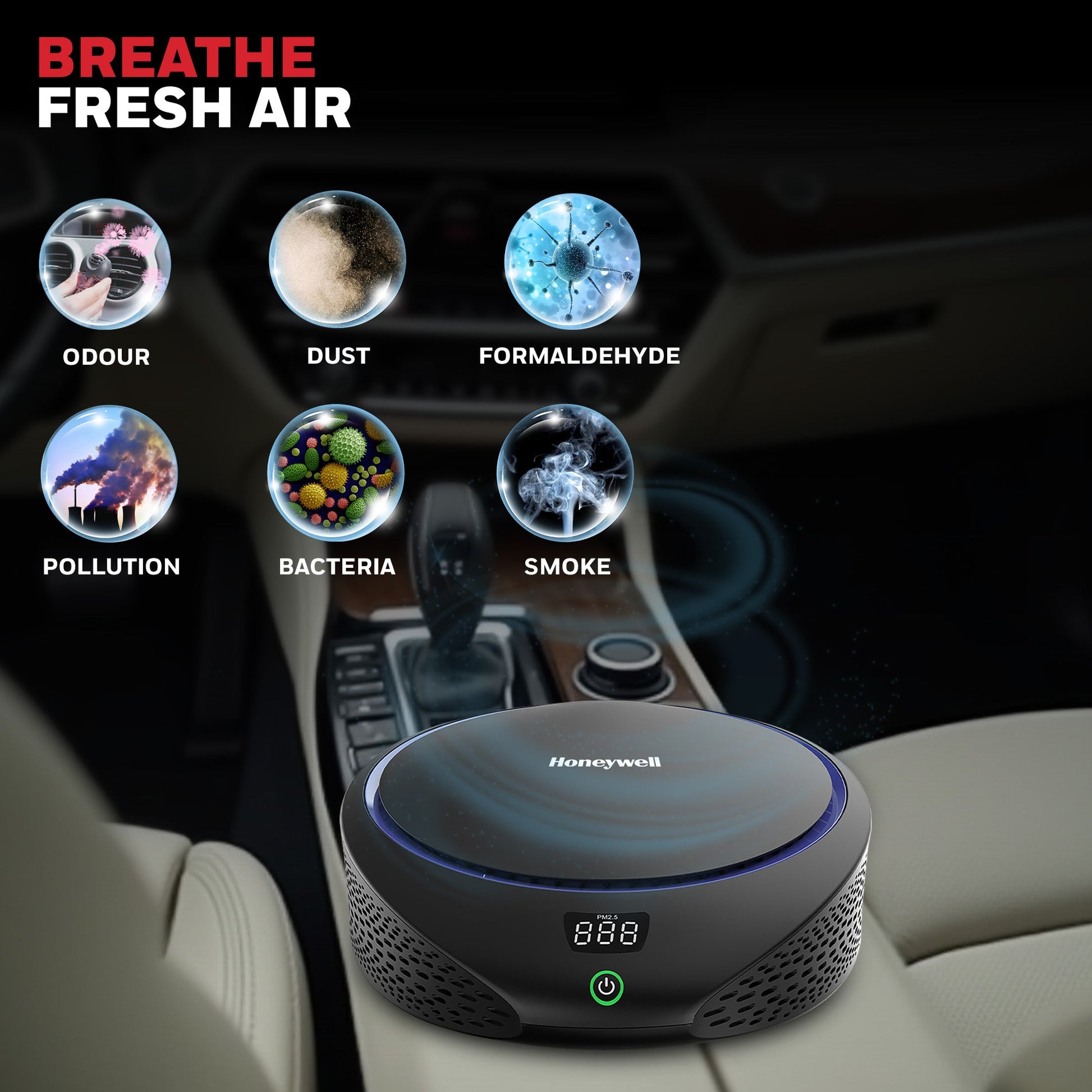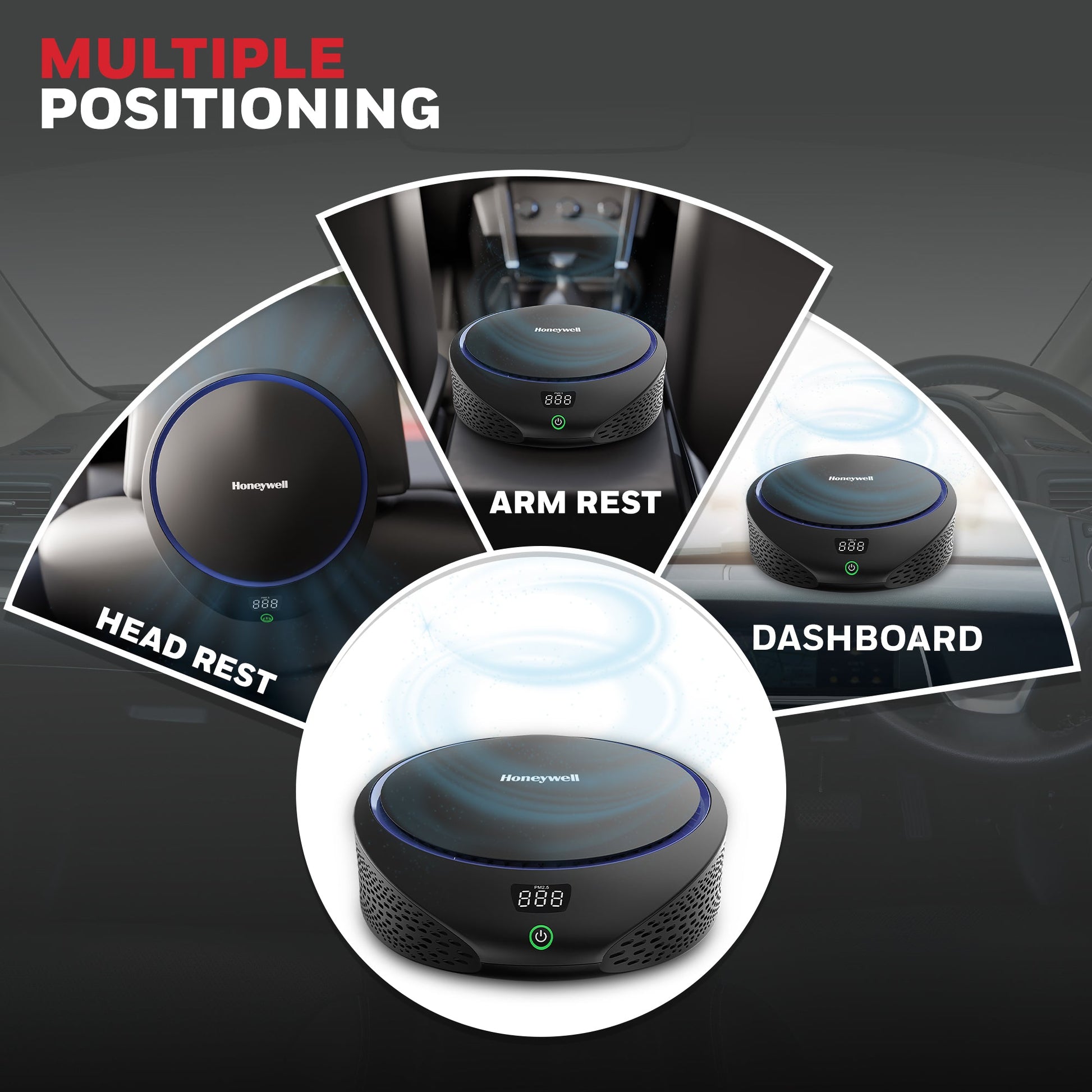Breathe cleaner on every drive with the Honeywell Move Pure 5 Car Air Purifier. Its 4-in-1 filtration system captures 99.99% of PM2.5, allergens, smoke, and VOCs, while real-time PM2.5 monitoring ensures you're always aware of air quality. With 3D airflow, odor elimination, negative ion output, and triple USB charging, it purifies and powers your journey. Compact and easy to install, it fits seamlessly into any car interior and comes backed by a 2-year manufacturer warranty.
