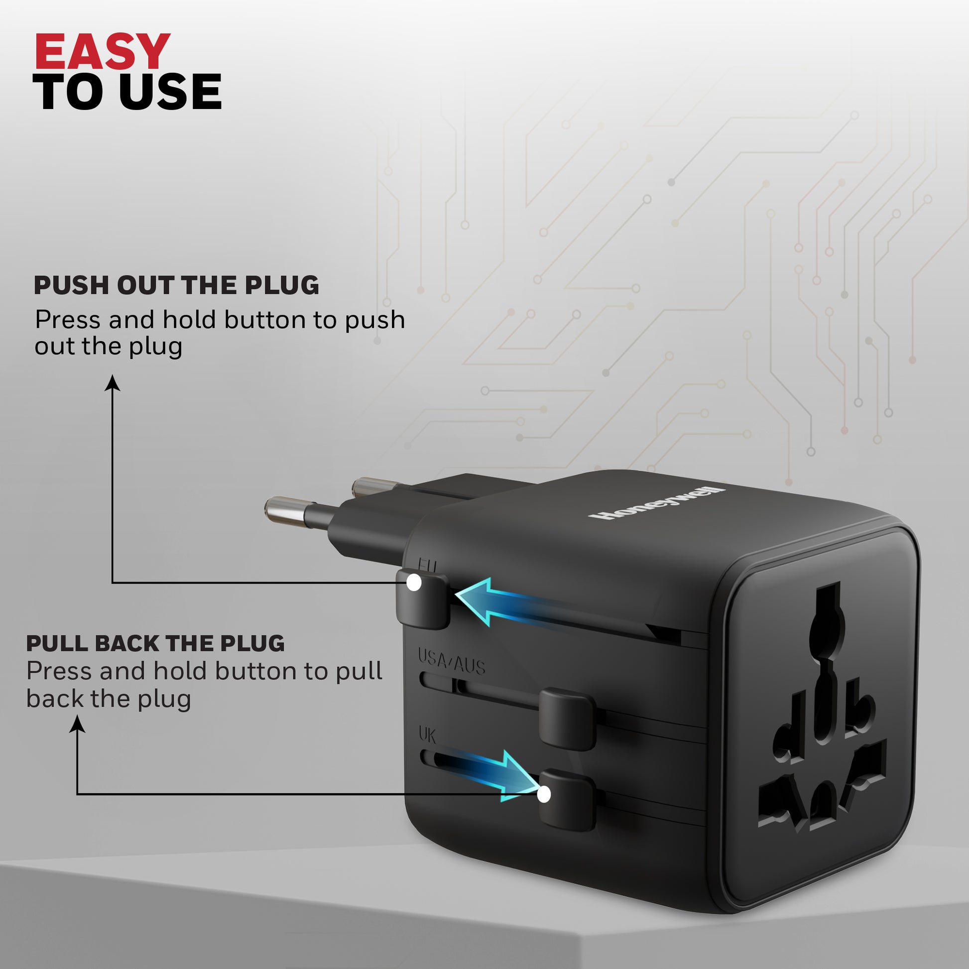 Honeywell New World Travel Adapter keeps you powered across 150+ countries with EU, US, UK & CN/AUS plug support. Featuring a dual-socket design, it charges two devices at once, from smartphones and tablets to laptops and cameras. Built-in overload and over-voltage protection safeguard your devices, while CE, FCC & RoHS certifications ensure safe performance. Compact, portable, and backed by a 3-year warranty, it’s the ultimate travel companion.