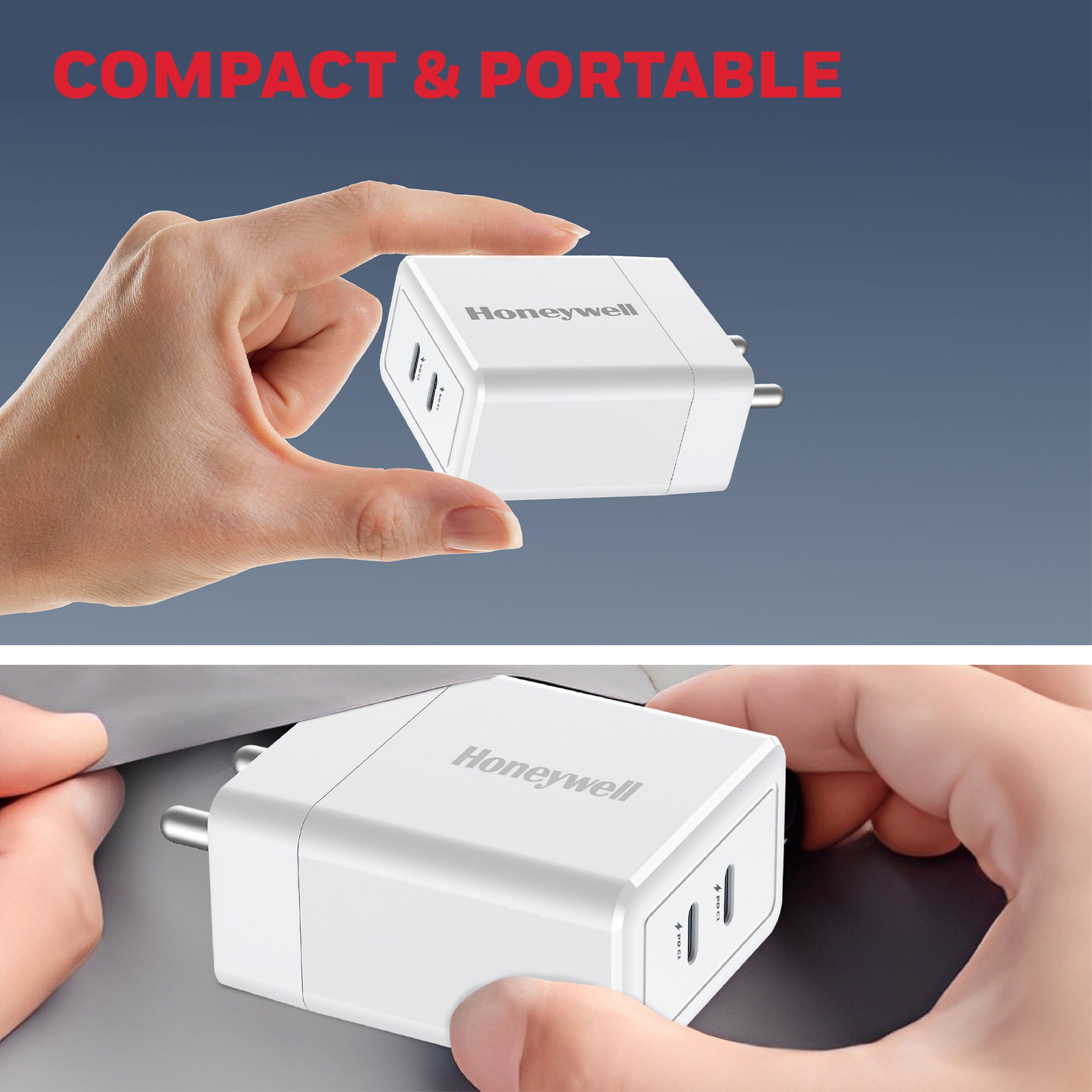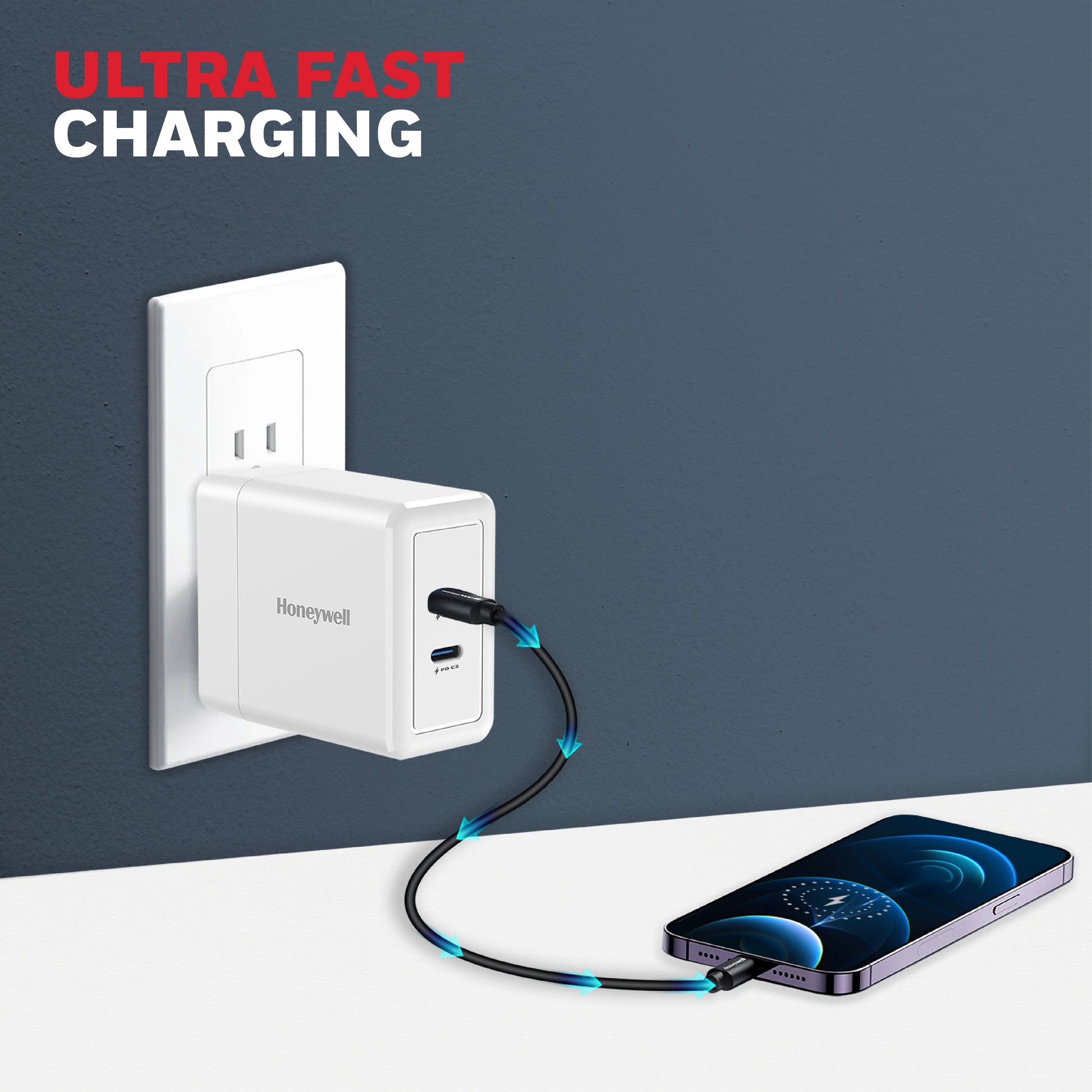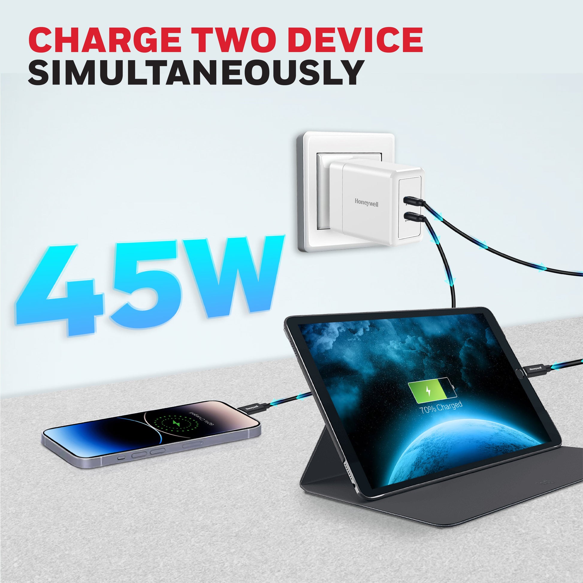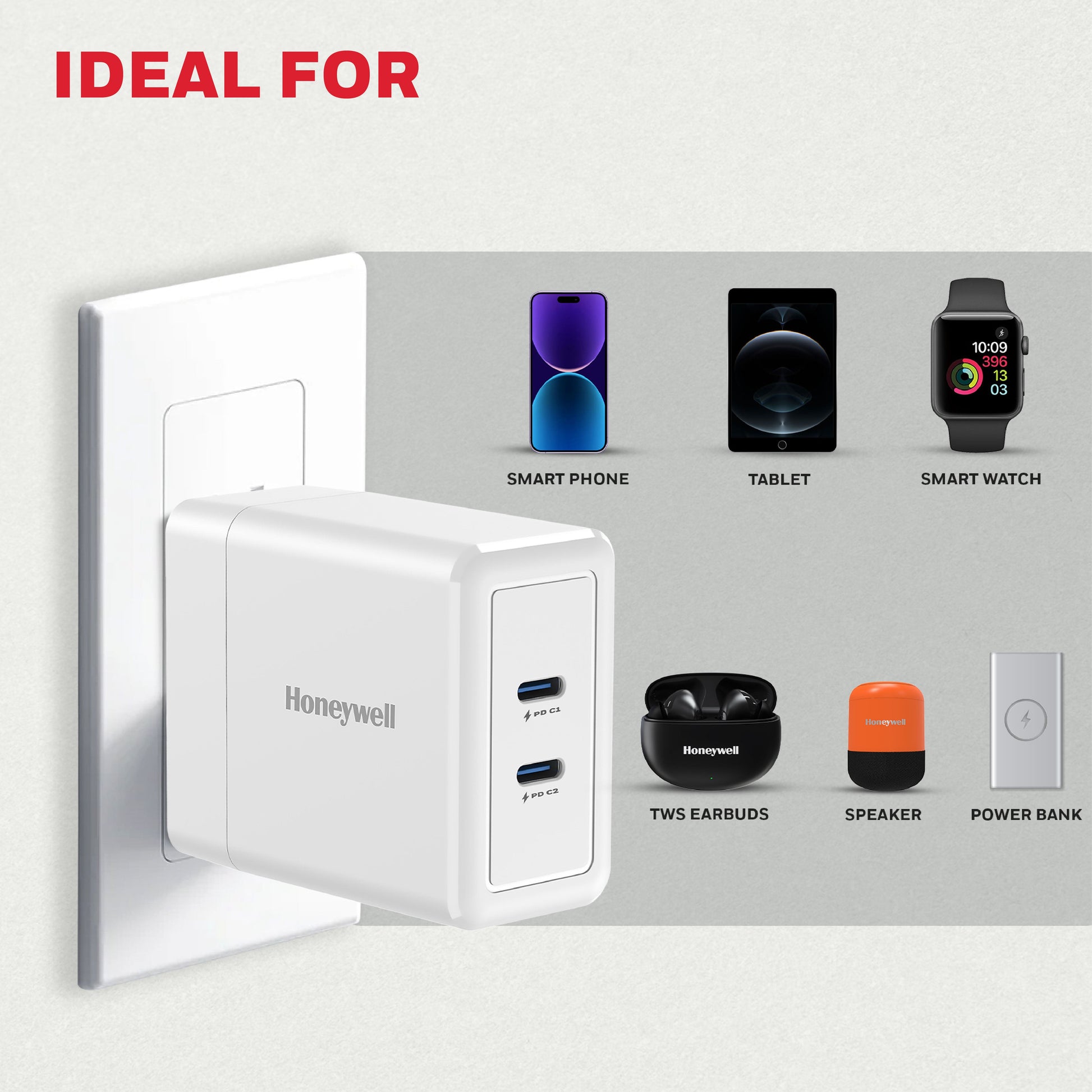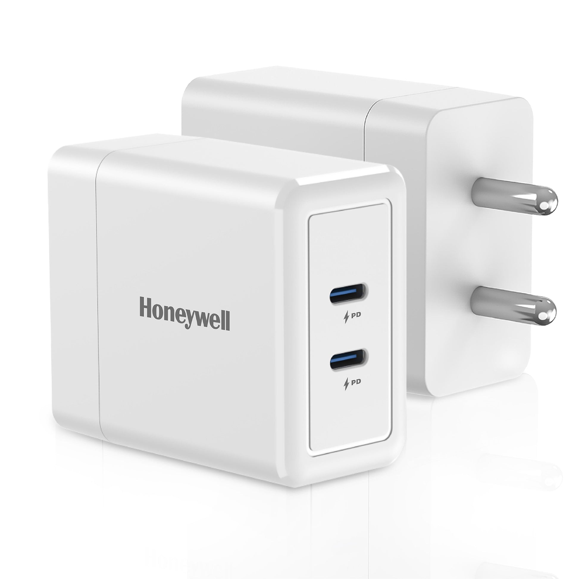 Honeywell Zest Charger GaN 45W: an ultra-fast wall charger featuring PPS support, 2x Type-C PD 3.0 ports, and BIS certification for safety and reliability. Compatible with a wide range of devices including iPhone, iPad Pro, Pixel, Galaxy, OnePlus, tablets, and smartwatches. With GaN technology, it delivers efficient and rapid charging, making it your go-to charger for all your devices.