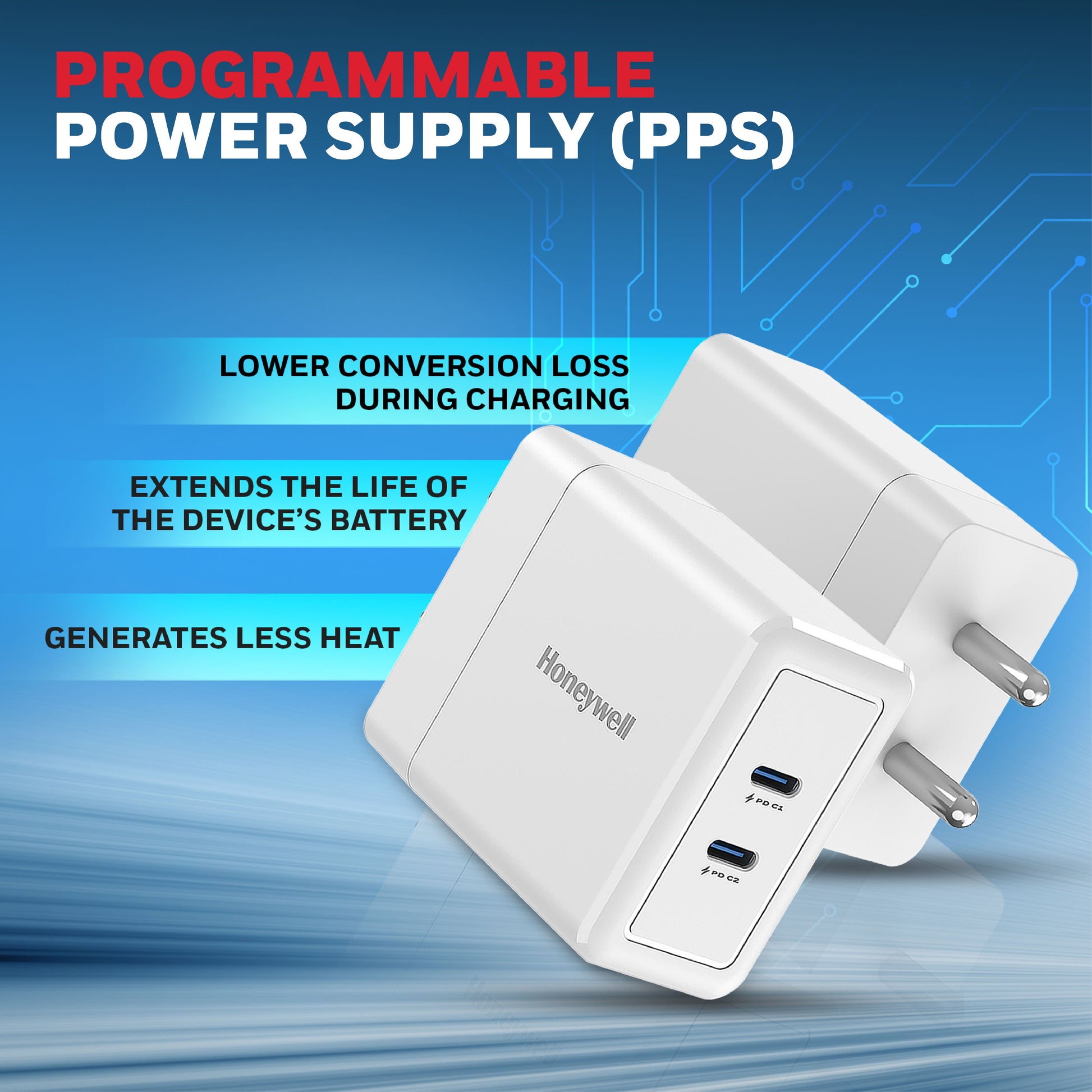 Q: Does it support PPS (Programmable Power Supply)? Ans: Yes, the Honeywell Zest GaN 45W Wall Charger supports PPS (Programmable Power Supply), allowing dynamic voltage adjustment for optimised fast charging and better battery health across compatible devices.