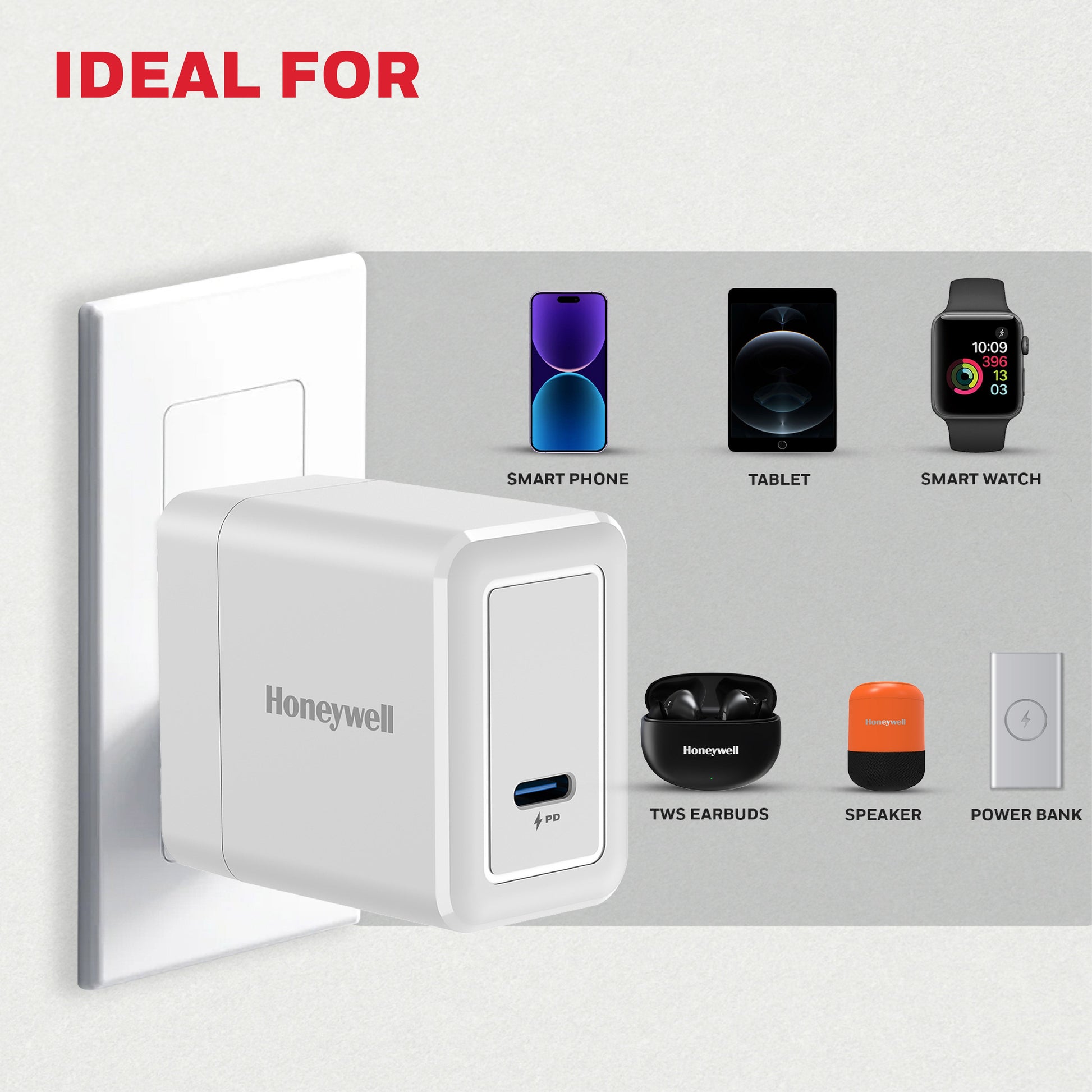 Honeywell Zest Charger PD20W: a Type-C ultra-fast wall charger with PPS support, BIS certification, and broad compatibility. Designed to charge iPhones, iPads, Samsung, OnePlus, smartphones, tablets, TWS earbuds, and Bluetooth speakers swiftly and efficiently. Its compact design makes it perfect for travel or daily use. Trust in its reliability and safety with BIS certification. Say goodbye to slow charging and power up your devices.