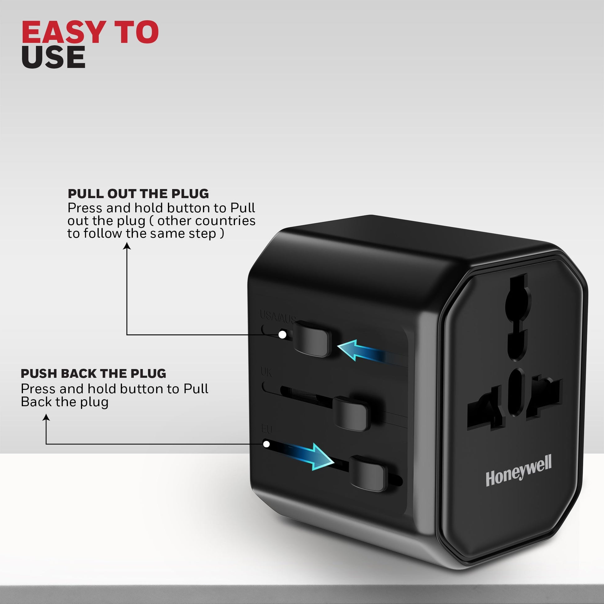 Q: How does a Honeywell Universal World Travel Adapter work? Ans: Honeywell Universal World Travel Adapters work by converting the plug shape of your device to match the socket type in another country or region. These best in class adapters do not convert voltage but provide safe, high-capacity connectivity.