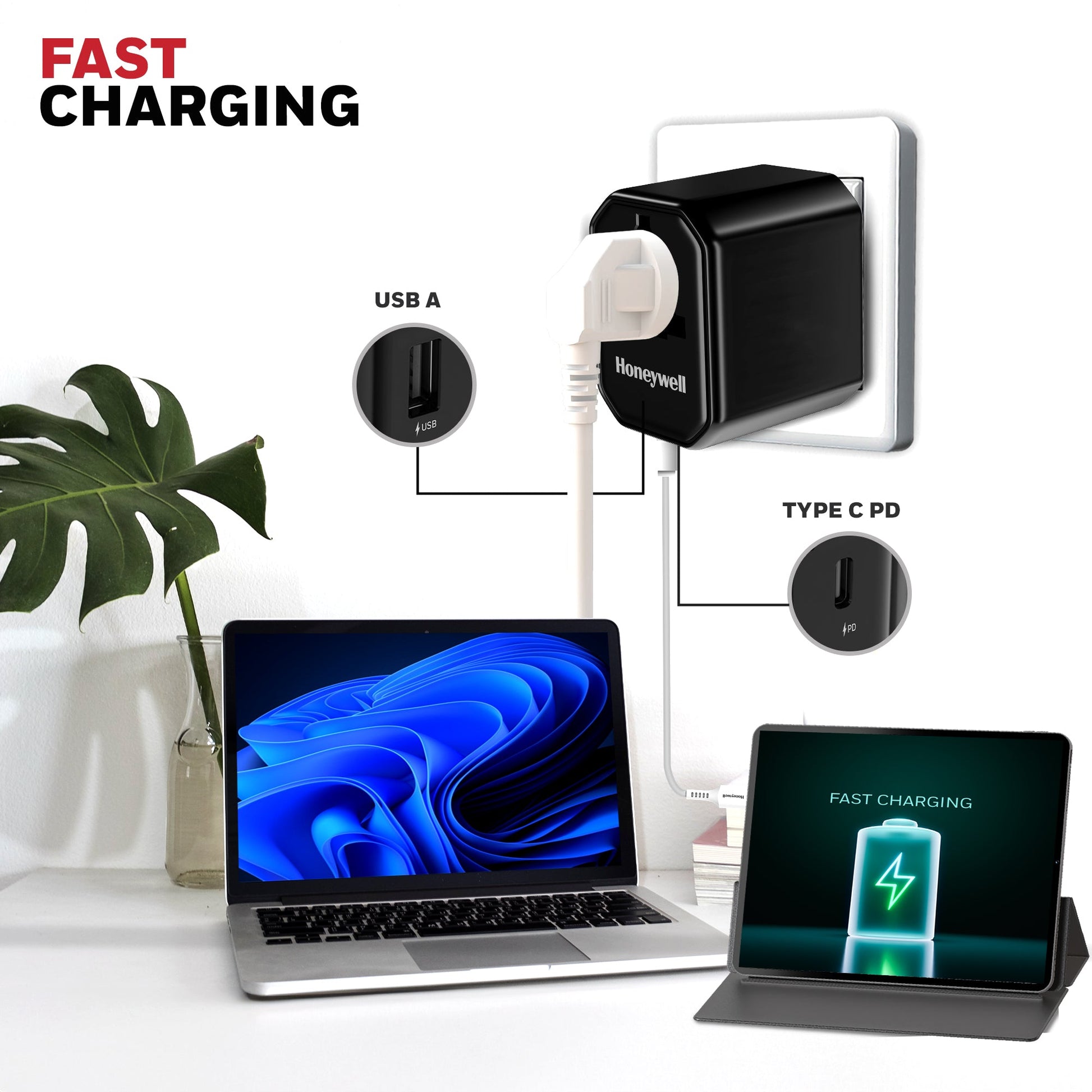 The Honeywell Universal Travel Adapter offers a compact and versatile solution for global travelers. Featuring a 12W, 3-in-1 fast charging capability with Type-C and USB-A ports, it accommodates devices from around the world. Compatible with sockets in the EU, US, UK, CN, and AUS, this wall charger ensures you stay powered up wherever you go. Backed by a 3-year manufacturer warranty, it's designed for convenience and reliability.