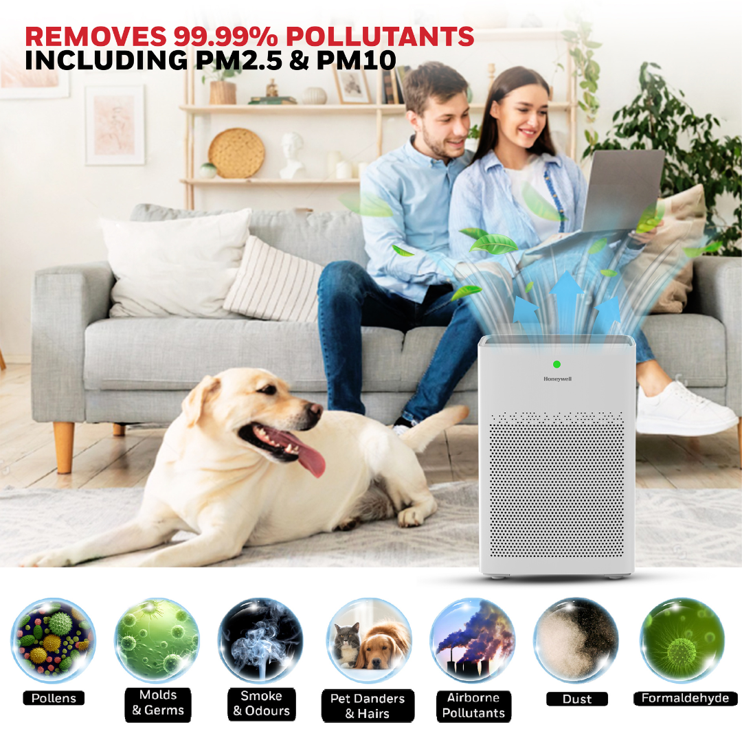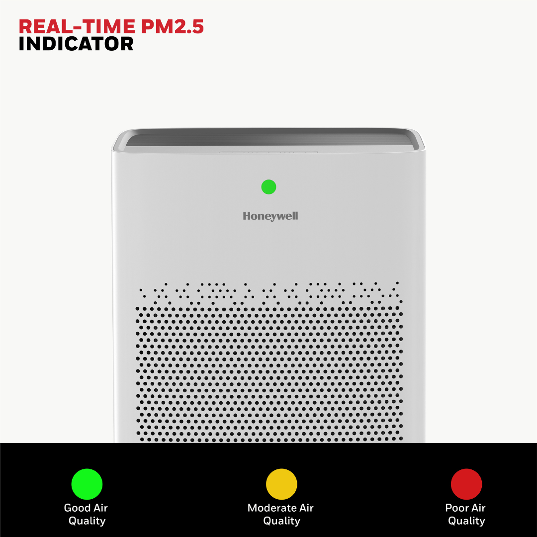 Honeywell Air touch P1 Air Purifier offers the ultimate air purification solution, ensuring a healthier and more comfortable indoor environment. With CADR of 450 m3/h, it can cover an area of up to 698 sq. ft / 64 sq. mtr with its advanced four-stage air filtration system that is equipped with a Pre-Filter, H13 HEPA Filter, Silver ION Anti H1N1 Layer & Activated Carbon Filter removing up to 99.99% of pollutants, micro-allergens, airborne pollutants including smoke, dust, pollens, VOC (Volatile organic Compounds), viruses and bacterias. Real time PM2.5 level Indicator to monitor air quality. Air purification cycle runs every 12 minutes to ensure optimal air purity. Experience superior air quality with Front & Upward Airflow technology, enhanced by 3D Air Flow. Enhance your indoor air quality with Air Touch P1 Air Purifier for home. Filter life of Up to 9000 hrs or 1 year. Filter Reset Indicator alerts you when its time to replace the filter. Child Lock Button. Quietly operates with a noise level of only 30dB/A. 2 Years Manufacturer Warranty.