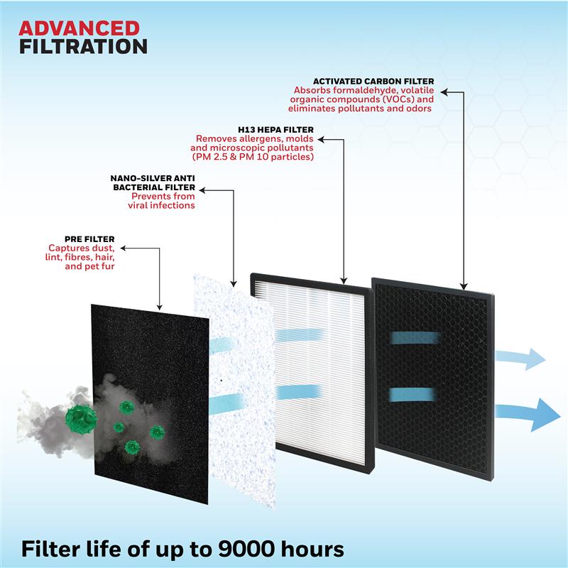 - Compound Filter: Pre Filter, Nano-Silver Anti Bacterial Filter, H13 HEPA Filter and Activated Carbon Filter