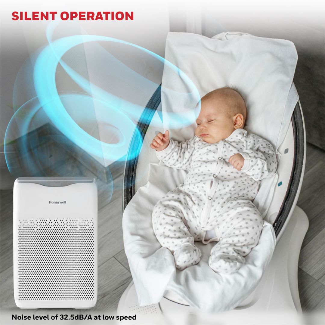 Ans: The Honeywell Air Touch V2 air purifier silently operates with a low noise level of 32.5db/A at low speed.