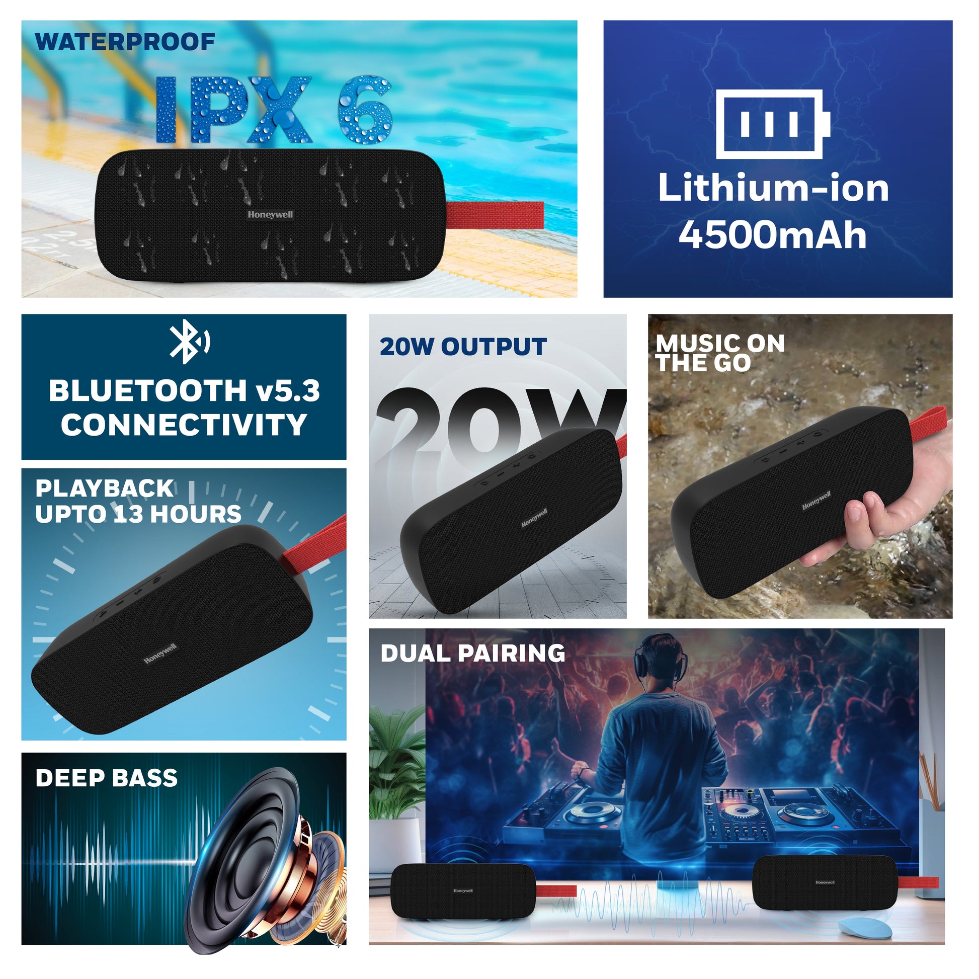 Ans: You should buy the Honeywell Bluetooth Speaker for its all-in-one convenience and everyday usability, such as: 1. Powerful 20W output for rich, room-filling sound 2. IPX6 waterproof design perfect for outdoor and splash-prone environments 3. Fast charging via a convenient Type-C port 4. Built-in microphone for hands-free phone calls 5. Multiple connectivity options: Bluetooth, SD card, USB, and 3.5mm AUX.