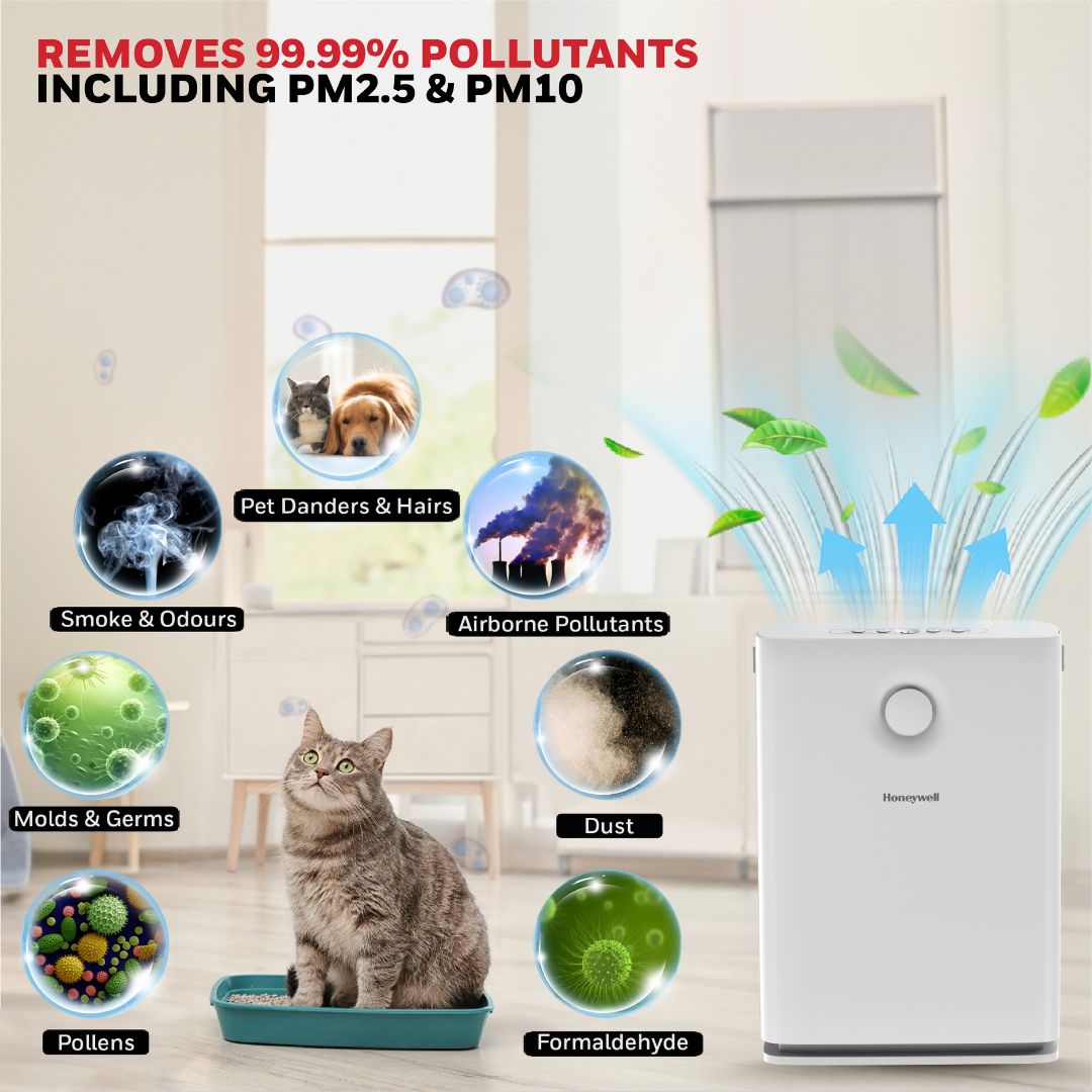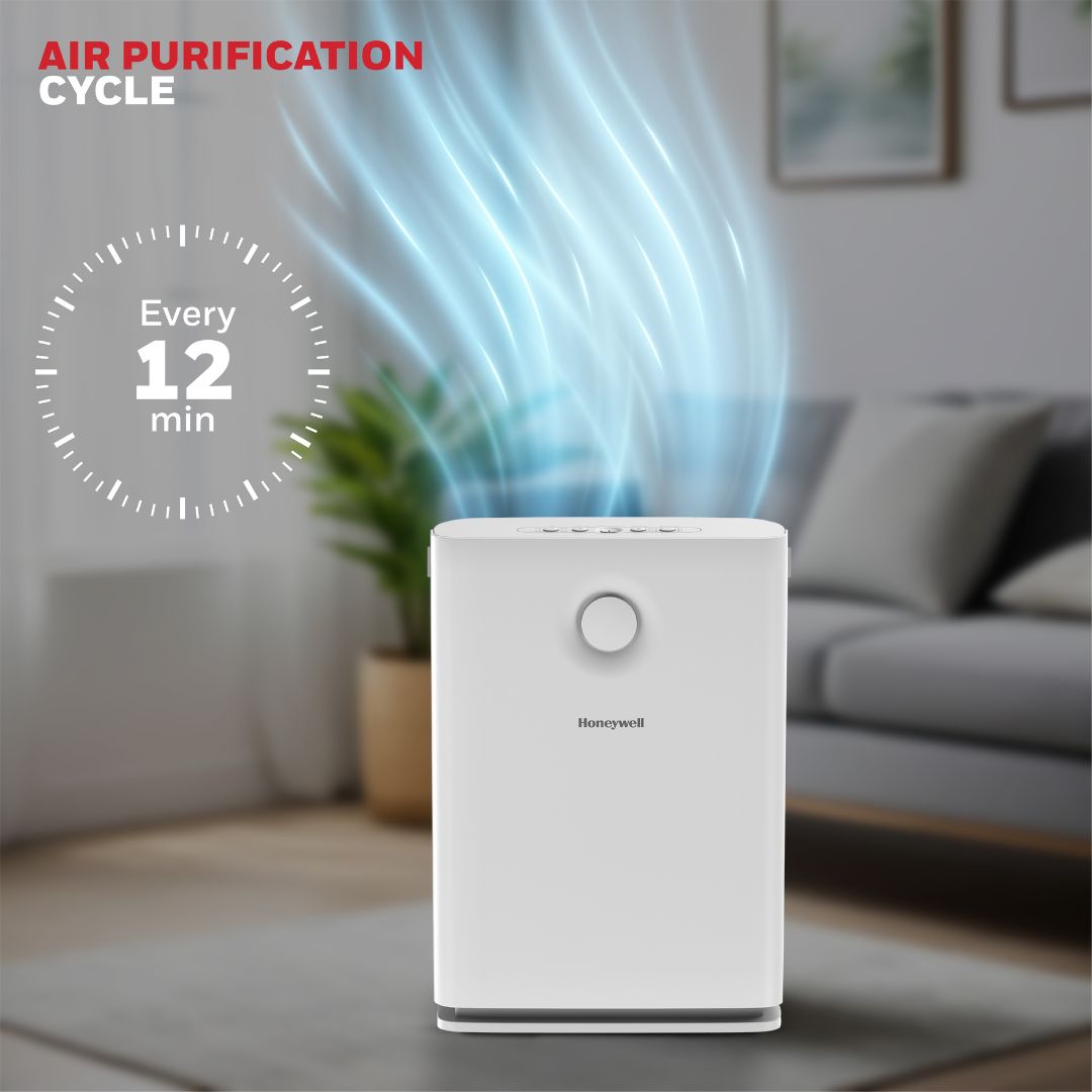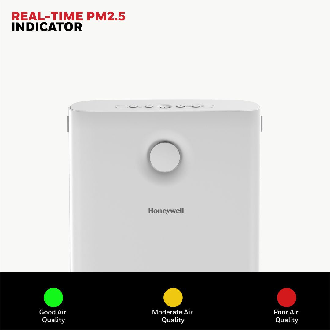 Honeywell Air touch V3 Air Purifier offers the ultimate air purification solution, ensuring a healthier and more comfortable indoor environment. With CADR of 300 m3/h, it can cover an area of up to 465 sq.ft / 43 sq. mtr with its five-stage air filtration system that is equipped with Pre filter, H11 HEPA Filter, High Grade H13 HEPA Filter, Silver ION Anti H1N1 Layer and Activated carbon filter - removing up to 99.99% of pollutants, micro-allergens, airborne pollutants including smoke, dust, pollens, VOC (Volatile organic Compounds), viruses and bacteria. Real time PM2.5 level Indicator to monitor air quality. Air purification cycle runs every 12 minutes to ensure optimal air purity. Experience superior air quality with Front & Upward Airflow technology, enhanced by 3D Air Flow. Enhance your indoor air quality with Air Touch V3 Air Purifier for home. Filter life of Up to 9000 hrs or 1 year. Filter Reset Indicator alerts you when its time to replace the filter. Child Lock Button. Quietly operates with a noise level of only 30dB/A. 2 Years Manufacturer Warranty.