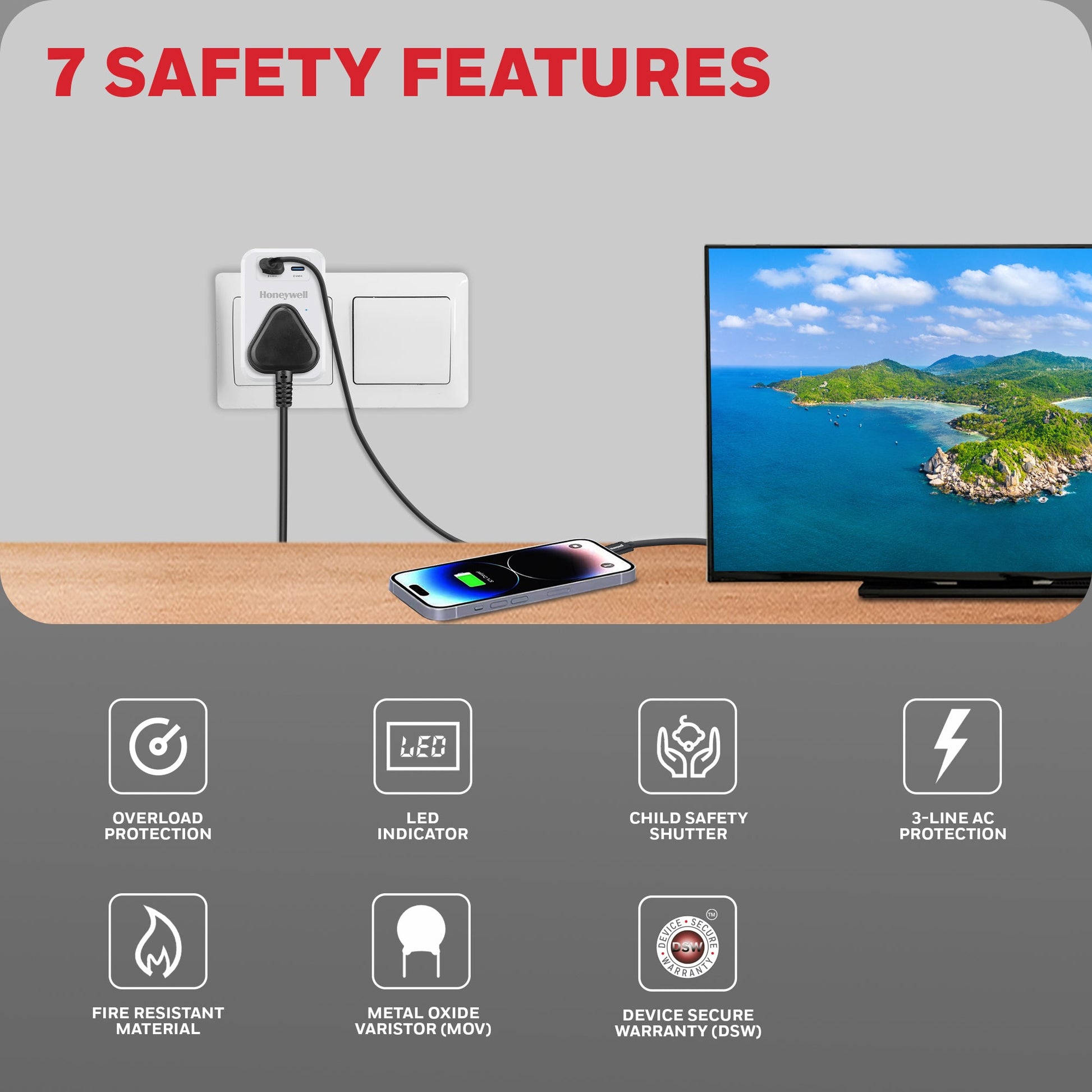 Q: What are the safety features of Honeywell Surge Cube? Ans: Honeywell surge cube are equipped with several safety features designed to enhance safety and protect your electronic devices: 1. Child safety shutters to prevent accidental electric shocks, especially for children. 2. Overload protection to safeguard against excessive current flow. 3. Fire-resistant materials for enhanced safety and durability. 4. Full 3-line surge protection across live, neutral, and ground lines. 5. MOV technology provides advanced surge absorption to protect your devices from power spikes. 6. Device Secure Warranty (DSW) offers added financial protection if your connected device is damaged despite using a Honeywell surge cube. 7. LED indicator to show real-time surge protection status.