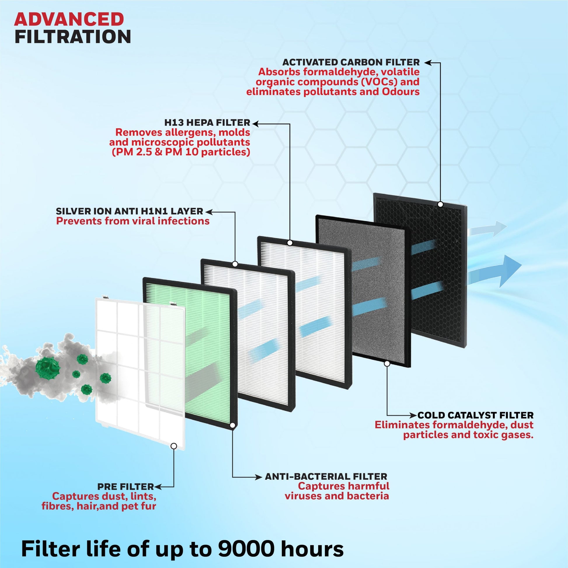 - Compound Filter 1: Anti-Bacterial Filter, Silver Ion and H13 HEPA Filter