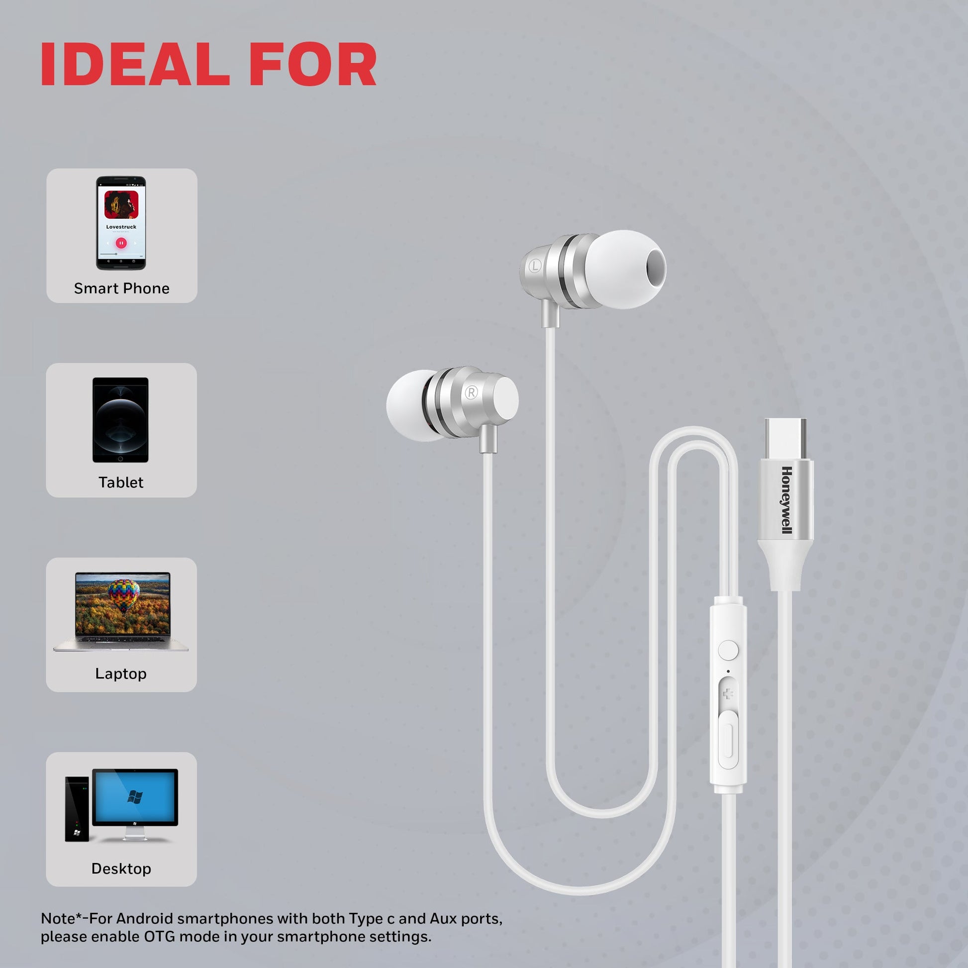 Q: Which devices are the Suono P60 Wired Earphones compatible with? Ans: Honeywell Wired Earphones are compatible with Android phones that have a Type-C port. However, if your device also includes a 3.5mm AUX jack, compatibility may vary. Please ensure OTG (On-The-Go) mode is enabled in your settings for proper functionality.