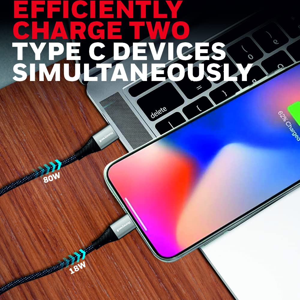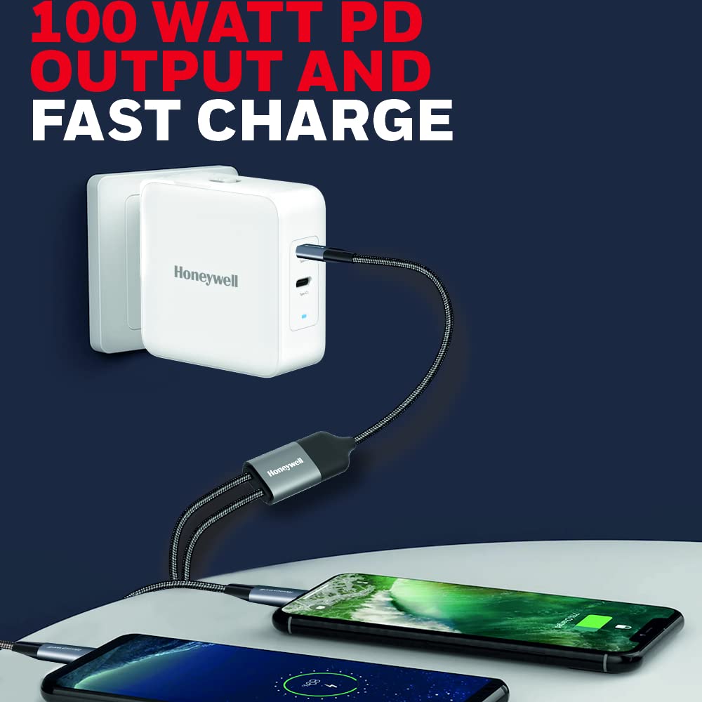 Honeywell Type C to Dual Type C Charge & Sync Cable is a rugged, cotton mesh braided cable with Aluminum Alloy casing for durability. This versatile cable lets you charge two devices simultaneously, supporting both Power Delivery (PD) and Quick Charge (QC) technology for efficient charging. It is universally compatible with Type-C devices, including laptops. With a rapid 100W fast charging speed for a single device and an 80W PD output to one device with 18W PD passthrough to the second device when two are connected. Backed by a 1-year warranty, it is your reliable choice for efficient charging and power delivery.