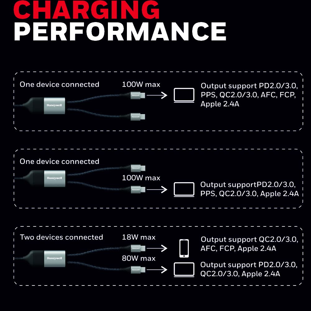 Q: Does this Honeywell cable support Power Delivery fast charging? Ans: Yes, the Honeywell Type-C to Dual Type-C cable supports Power Delivery (PD) fast charging up to 100W, depending on the power output of the source device. For optimal performance, connect it to a high-wattage USB-C power adapter that supports dual device charging, making it ideal for powering smartphones, tablets, laptops, and other USB-C devices efficiently.