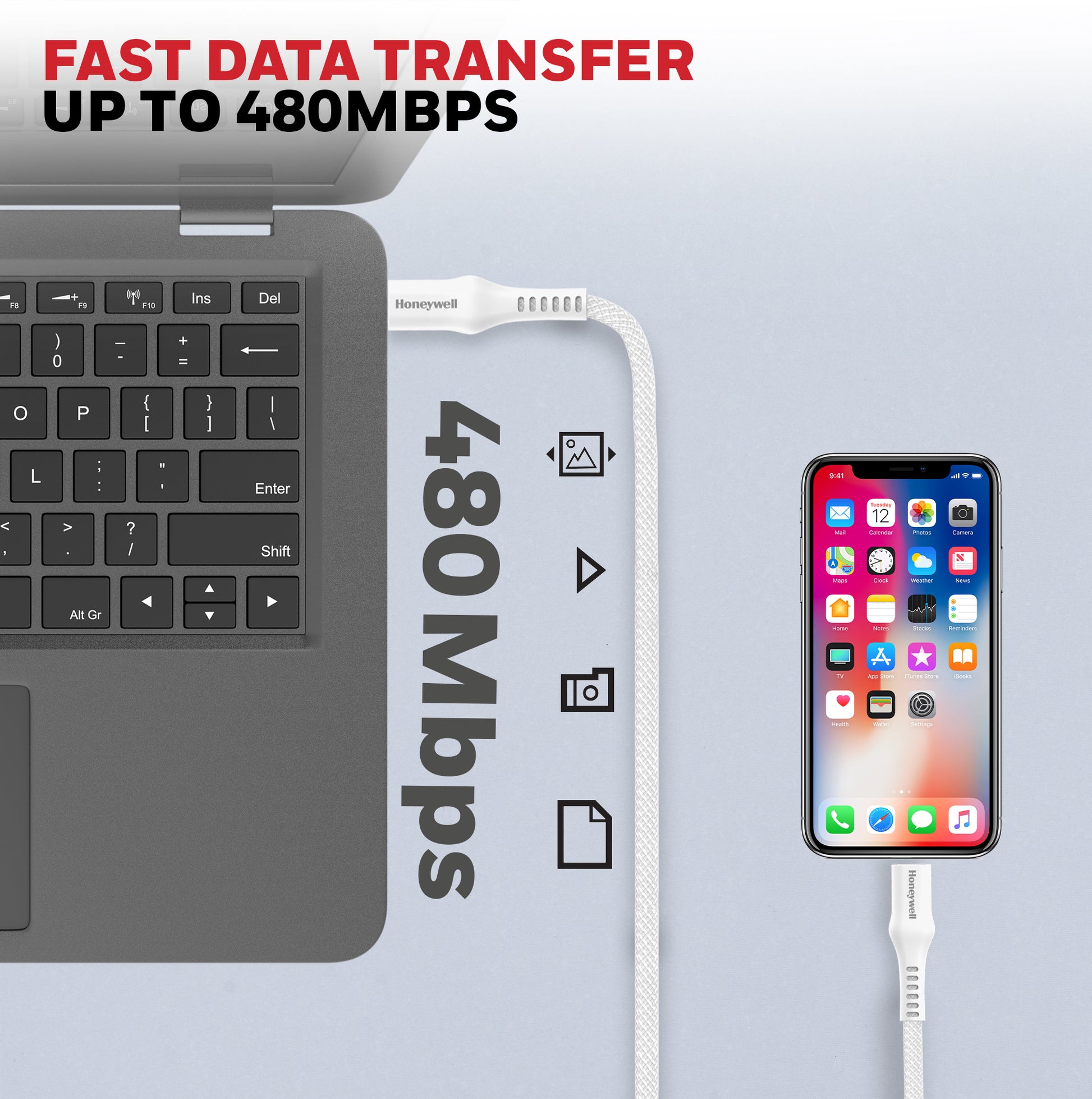 Honeywell 1.2M Nylon Braided Type-C Cable delivers reliable fast charging and data transfer with QC 3.0 and PD support up to 60W. Built with nickel-plated connectors and tested for 10,000+ bends, this ultra-compact, tangle-free cable ensures long-lasting durability. Enjoy charging speeds up to 3A and steady 480Mbps data transfer across laptops, smartphones, tablets, and more. Backed by a 2-year manufacturer warranty for trusted performance.