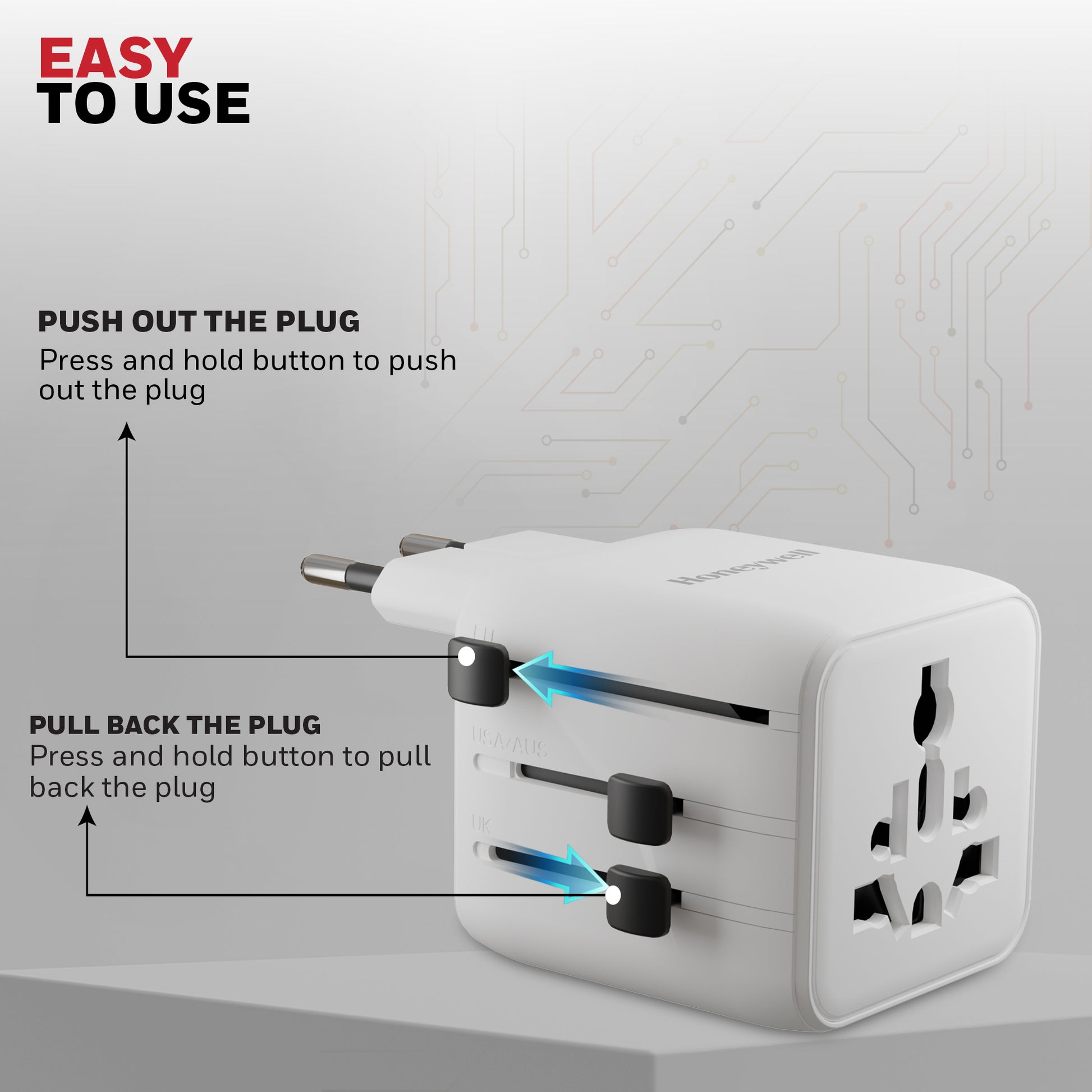 Honeywell New World Travel Adapter keeps you powered across 150+ countries with EU, US, UK & CN/AUS plug support. Featuring a dual-socket design, it charges two devices at once, from smartphones and tablets to laptops and cameras. Built-in overload and over-voltage protection safeguard your devices, while CE, FCC & RoHS certifications ensure safe performance. Compact, portable, and backed by a 3-year warranty, it’s the ultimate travel companion.