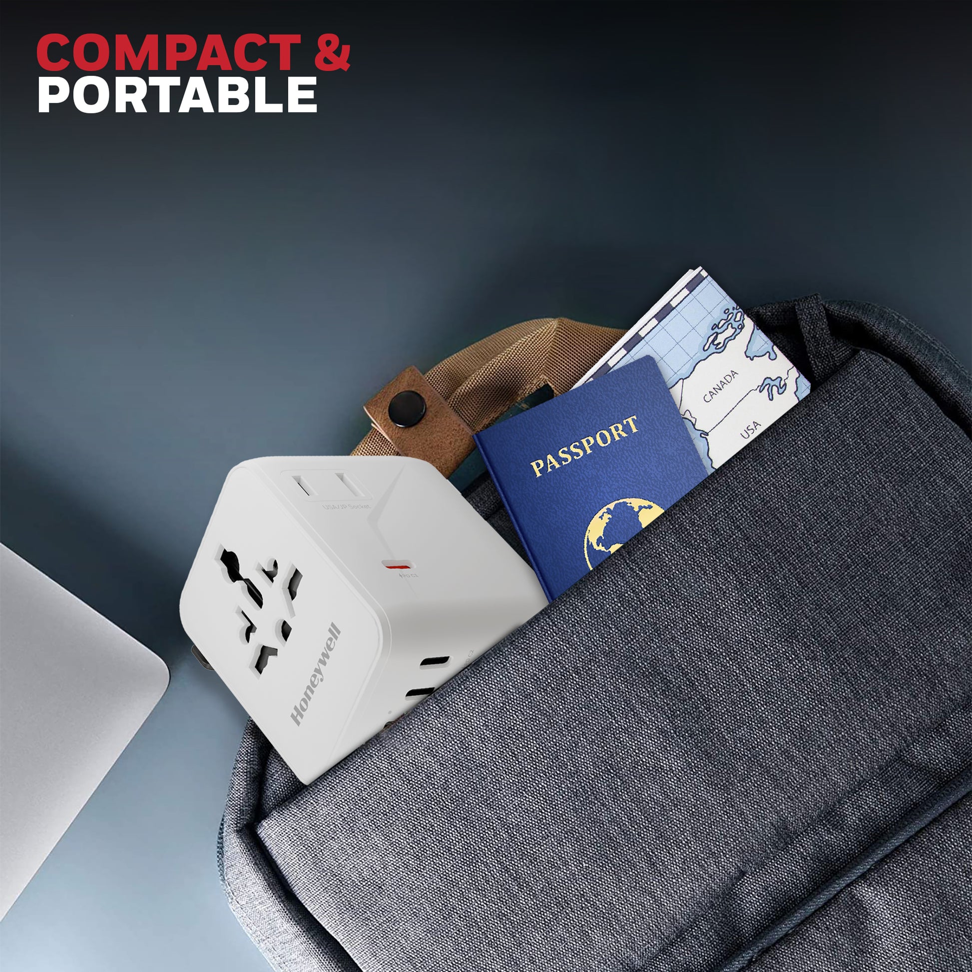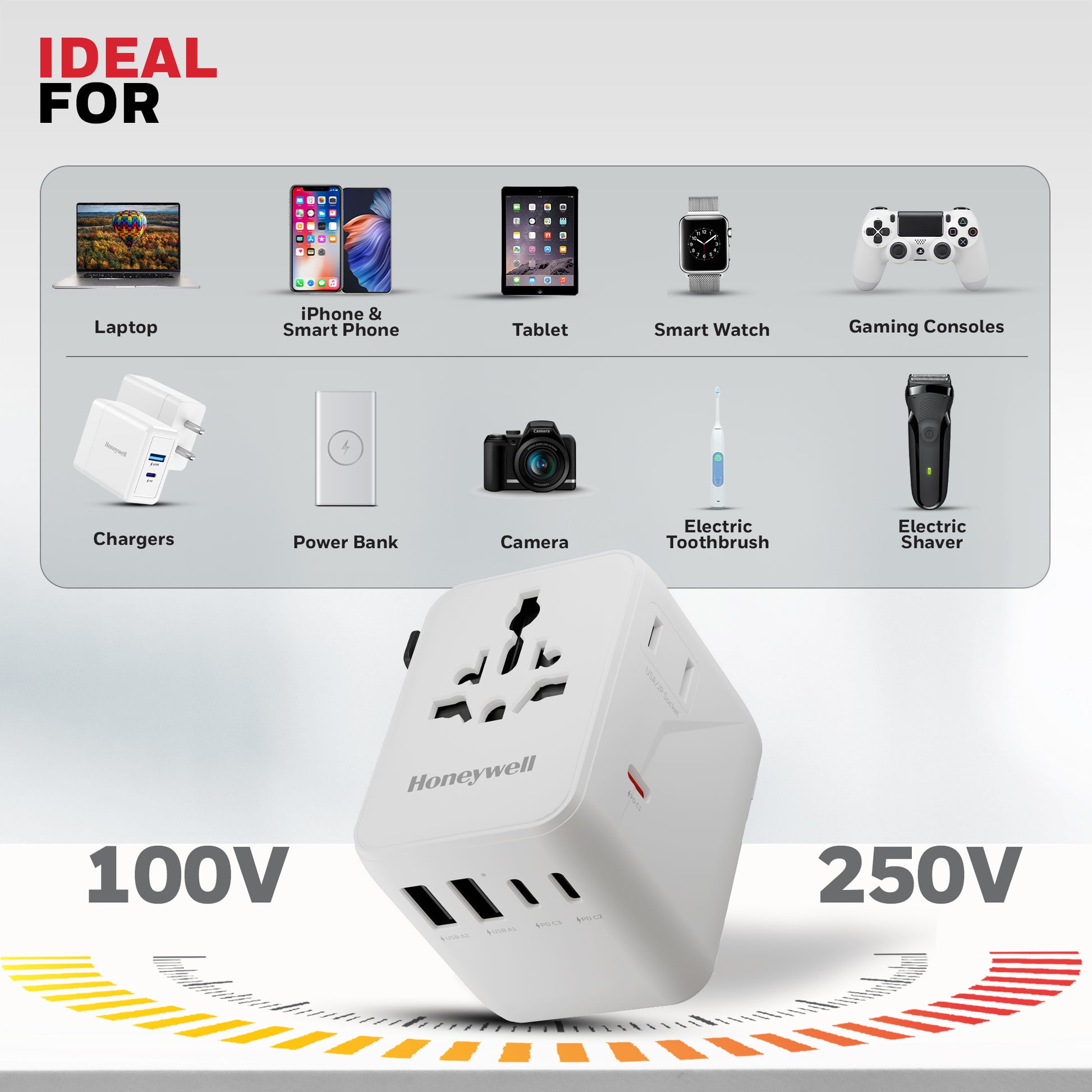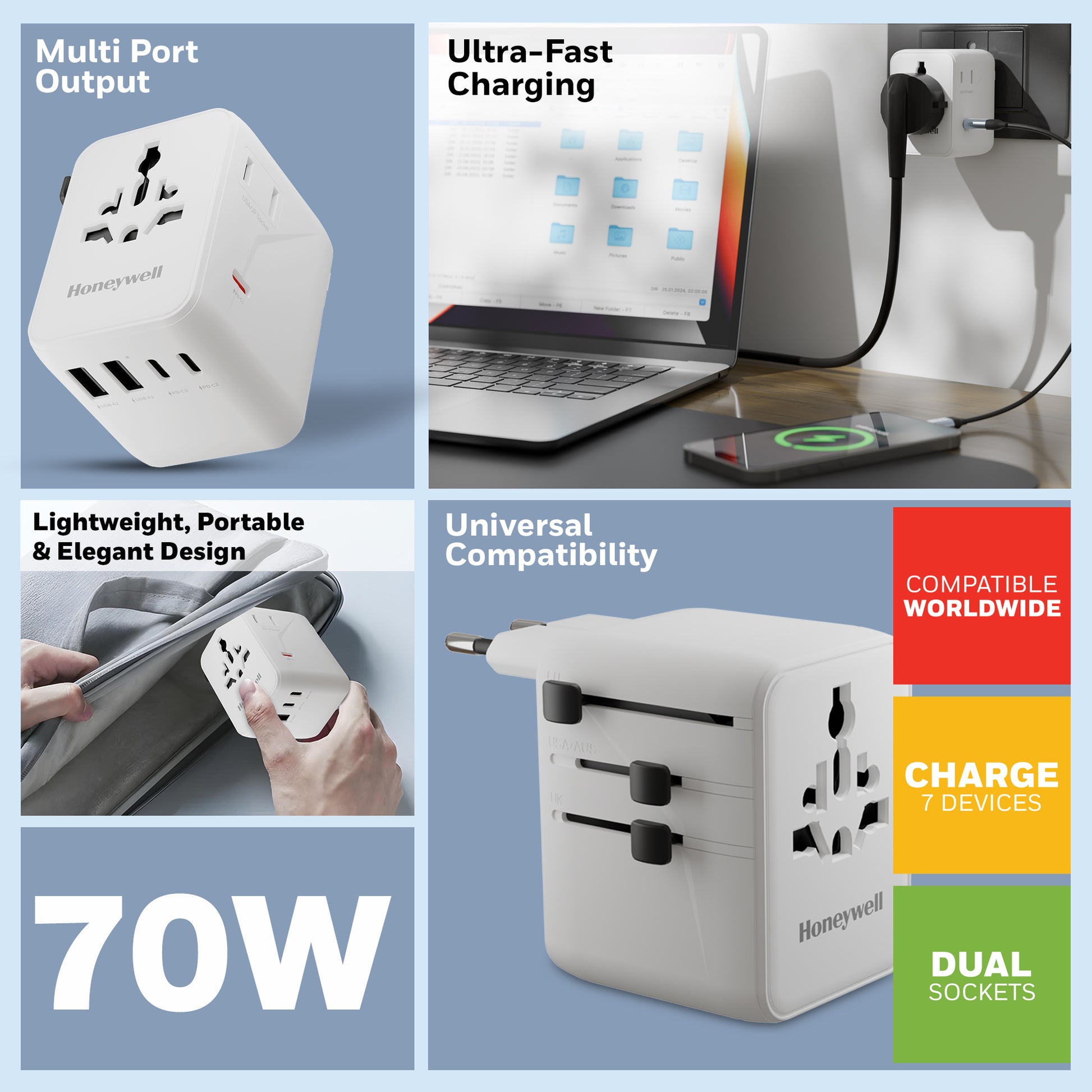Honeywell Universal Travel Adapter 70W powers your journey in 150+ countries with EU, US, UK & CN/AUS plug support. A 7-in-1 hub charges up to 7 devices at once via 3 Type-C ports, 2 USB-A ports, and dual sockets. With 70W PD fast charging, QC3.0 support, and 2500W max power, it’s built for laptops, tablets, and smartphones. Certified by FCC, CE & RoHS, it includes overload protection, compact portability, and a 3-year warranty for global reliability.