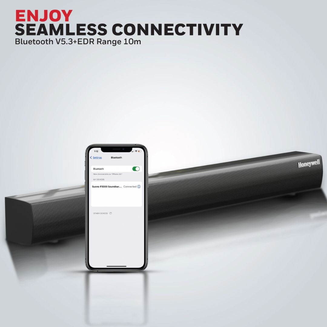 ถาม: มีตัวเลือกการเชื่อมต่อใดบ้าง? ตอบ: ซาวด์บาร์ Honeywell Suono P3000 รองรับ Bluetooth V5.3 + EDR (ระยะสูงสุด 10 เมตร) และรองรับการเชื่อมต่อ 5-in-1 ที่หลากหลายผ่าน Bluetooth, AUX, USB และ HDMI/ARC