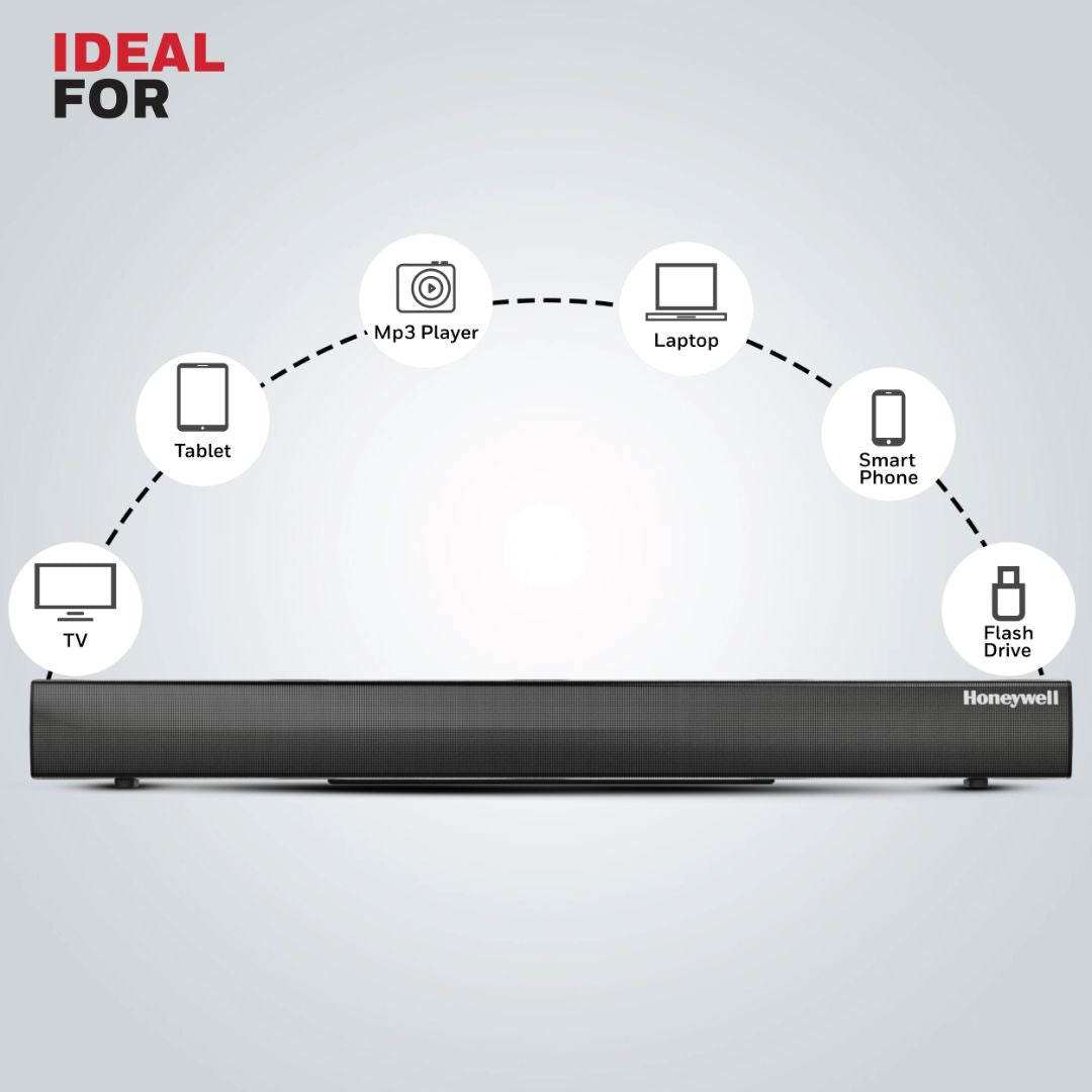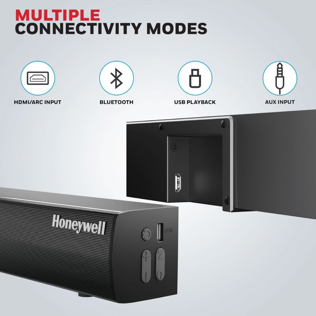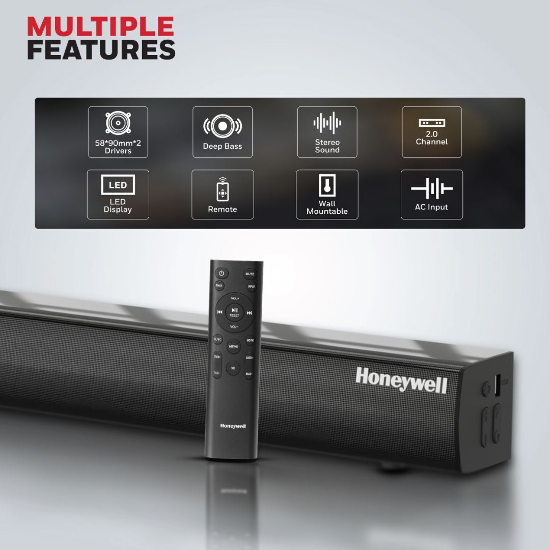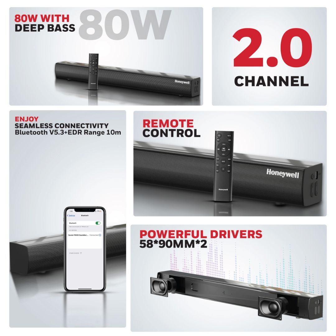 - เพื่อนร่วมทางเสียงอันทรงพลัง: สัมผัสประสบการณ์ความบันเทิงอันน่าตื่นตาตื่นใจด้วยซาวด์บาร์ Honeywell Suono P3000 ที่มีเอาต์พุต 80 วัตต์จากไดรเวอร์คู่ขนาด 58*90 มม. ยกระดับประสบการณ์เสียงของคุณ